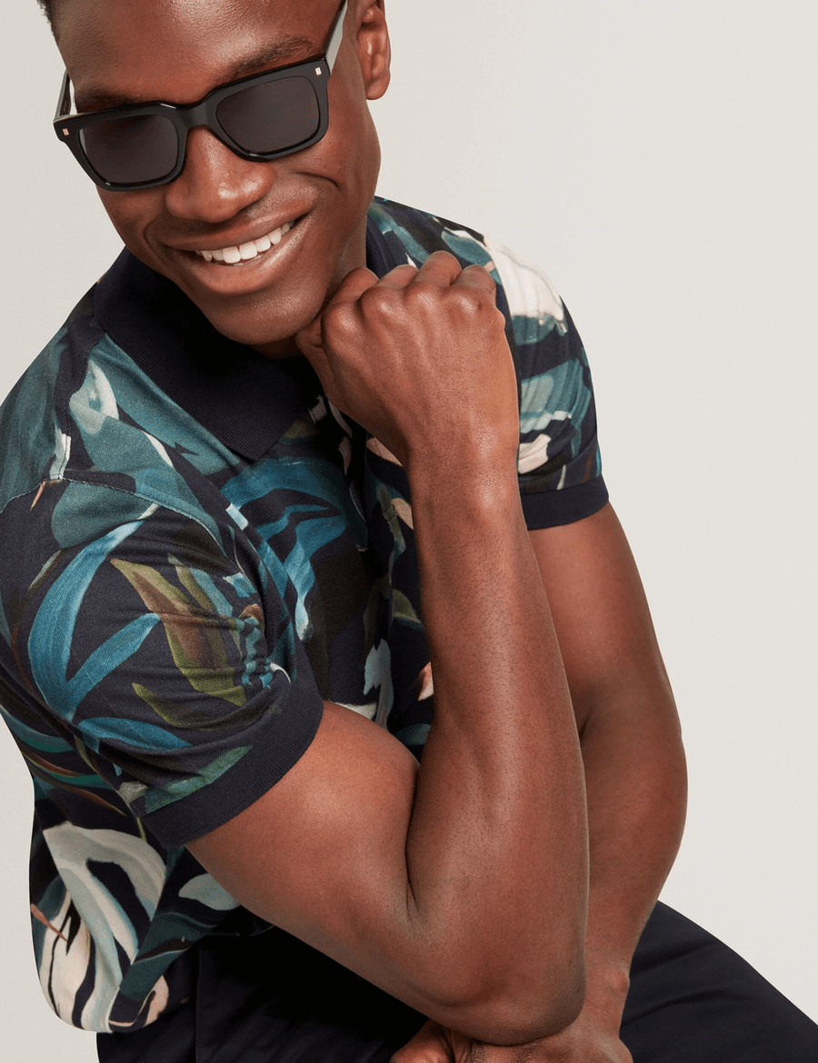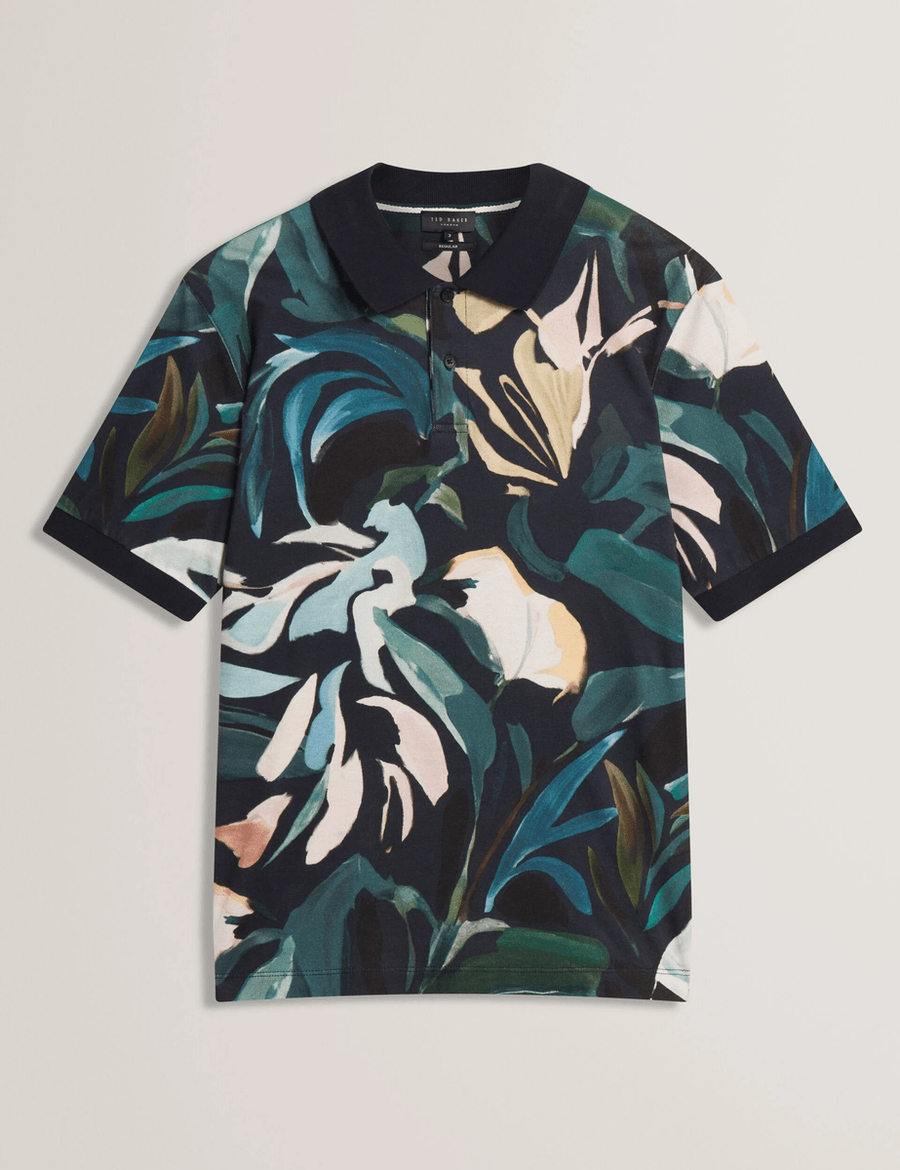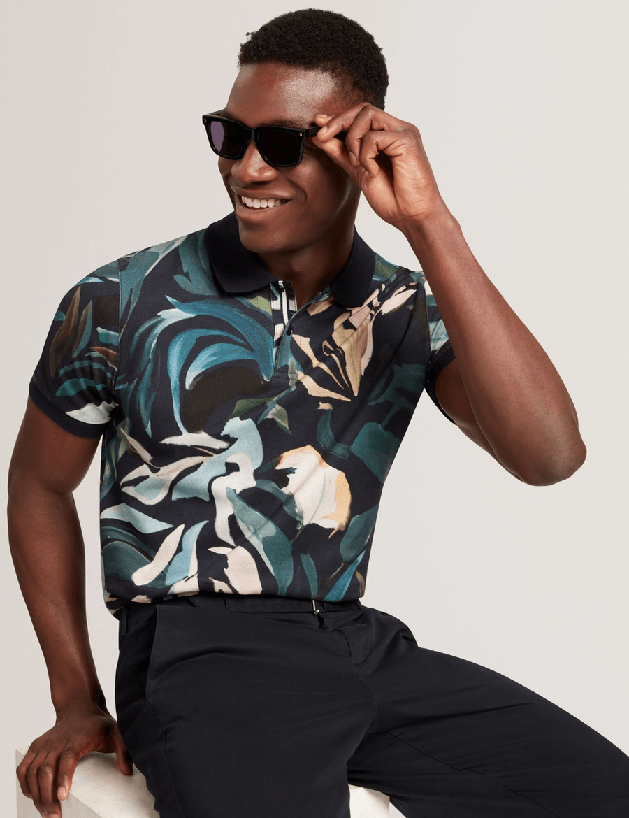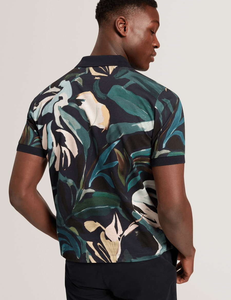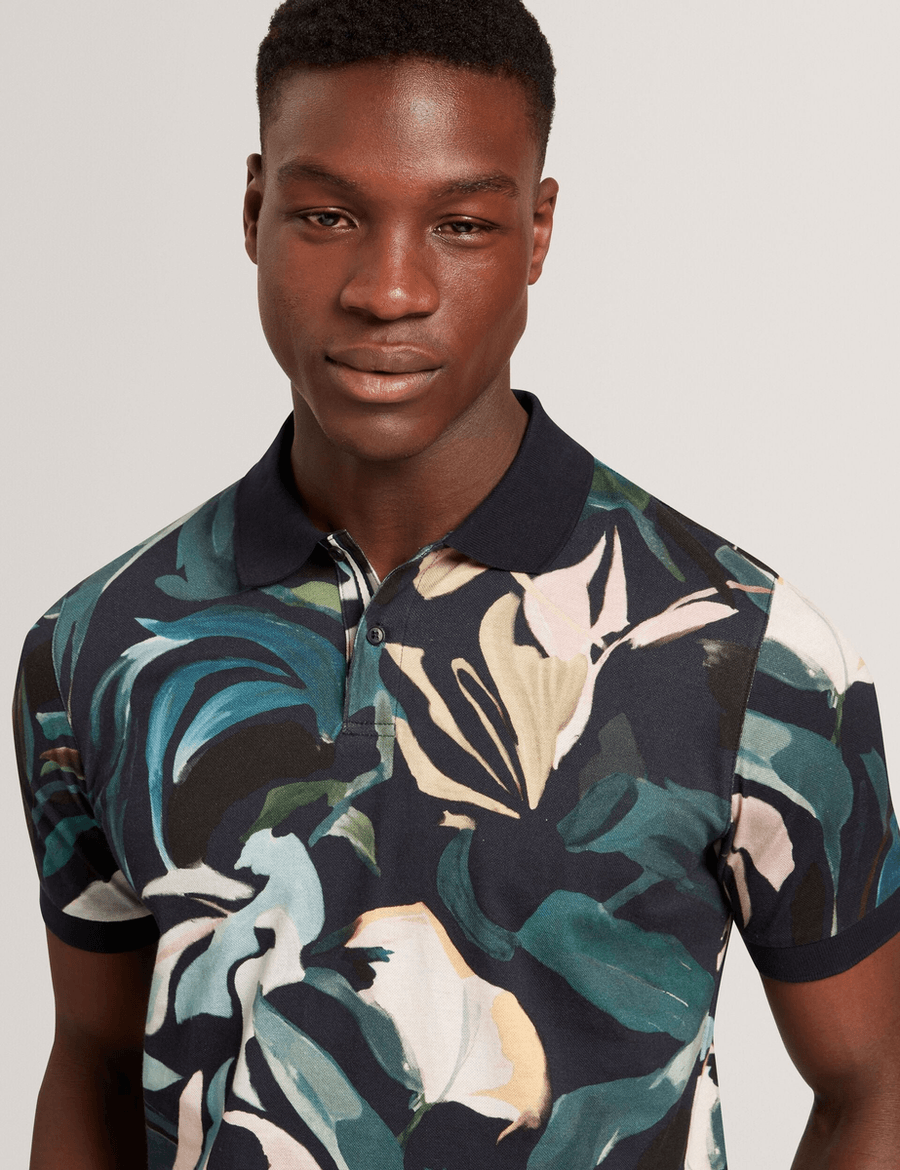 Discover the perfect blend of elegance and comfort with the Ted Baker KIVEM | BLACK short sleeve polo shirt. Featuring a stunning abstract painted floral print, this shirt is designed to make a statement, whether you're at a casual outing or a semi-formal gathering.