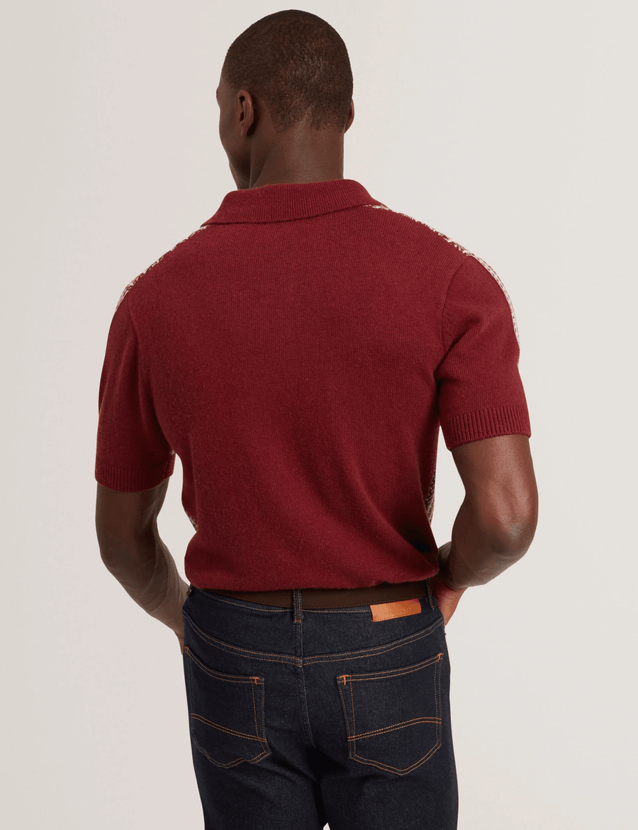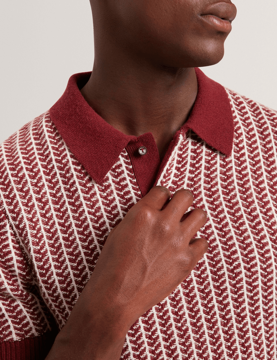 Elevate your wardrobe with the Ted Baker KOLOMER in maroon, a short sleeve polo that combines sophistication and comfort. Crafted from a luxurious blend of cashmere and wool, this polo features a unique herringbone texture, making it a standout piece in your collection.