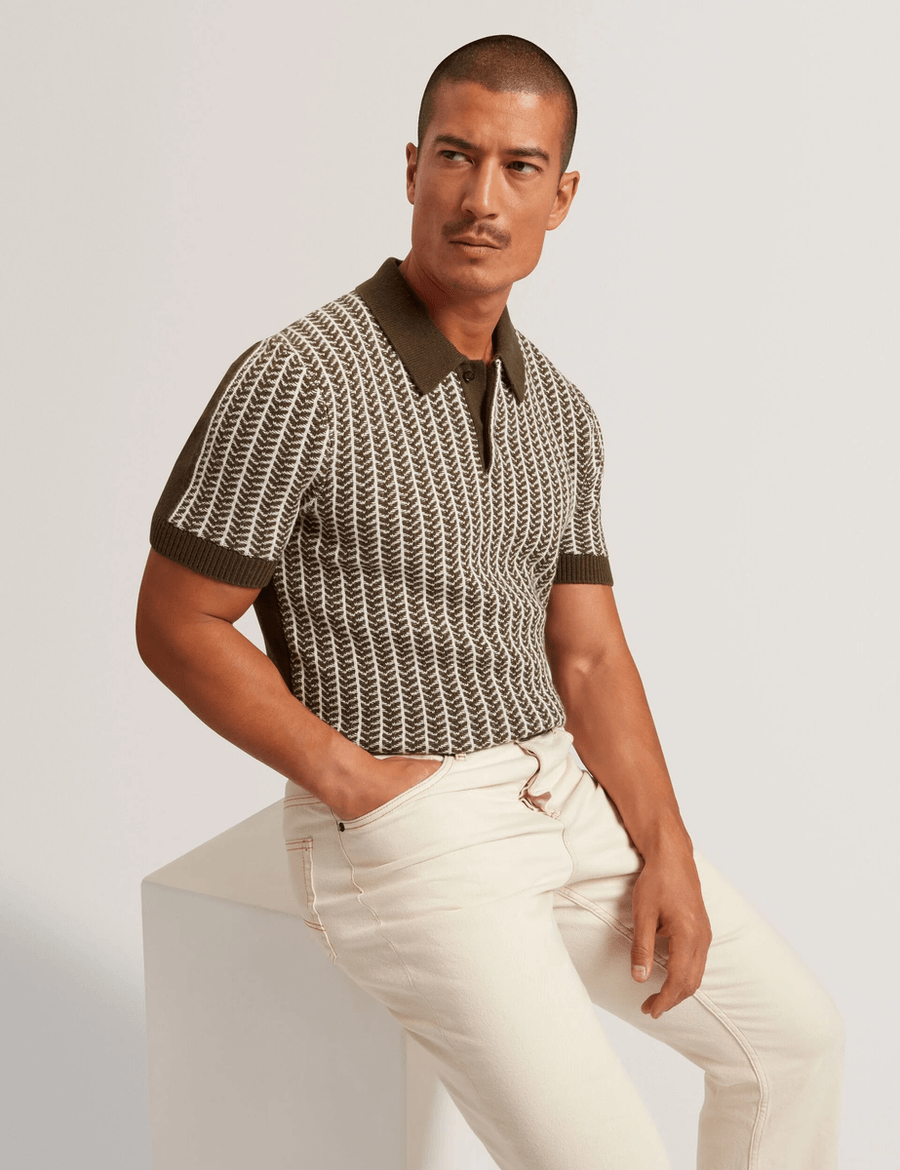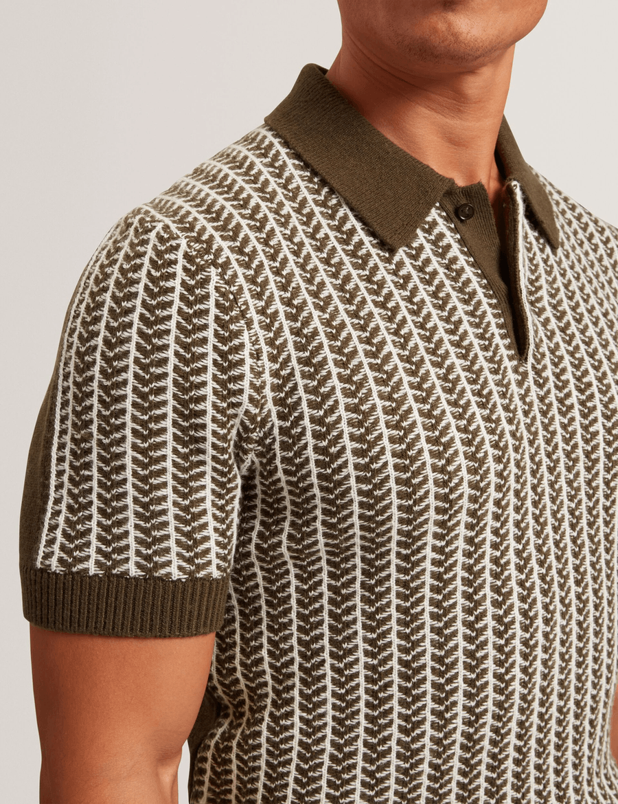 Discover the ultimate in luxury with the Ted Baker KOLOMER | OLIVE short sleeve polo. Crafted from a premium knit blend of cashmere and wool, this polo features a unique herringbone texture that exudes sophistication and style.