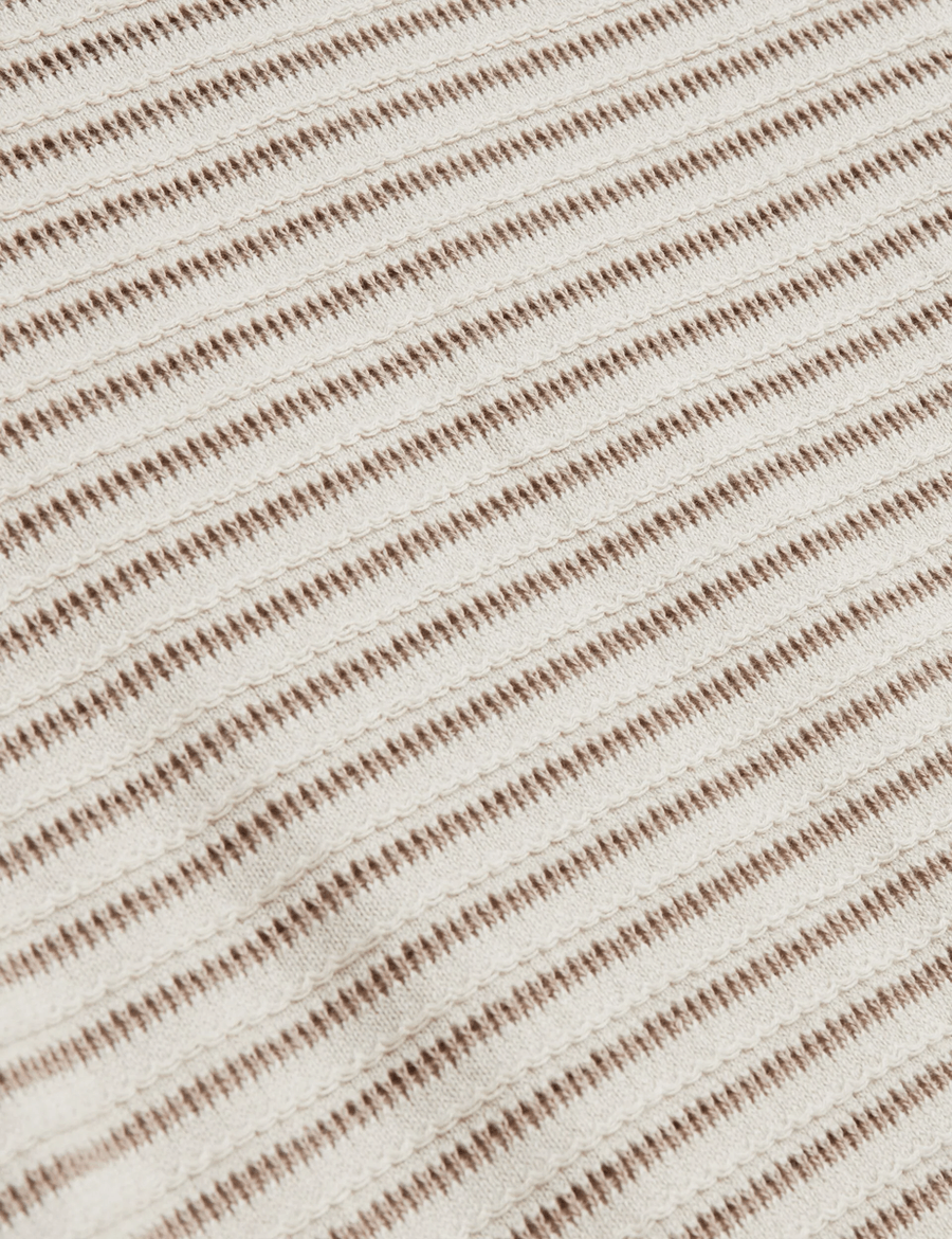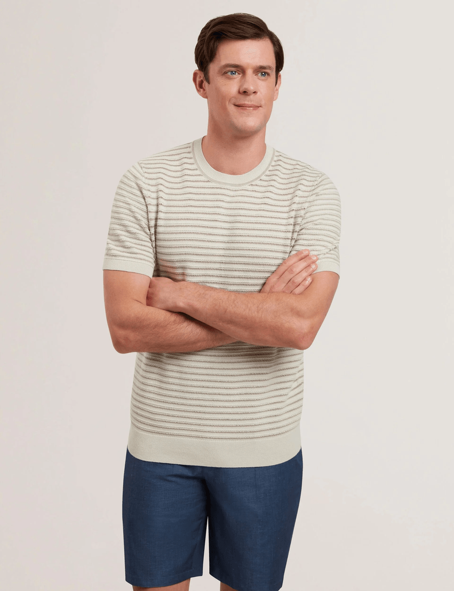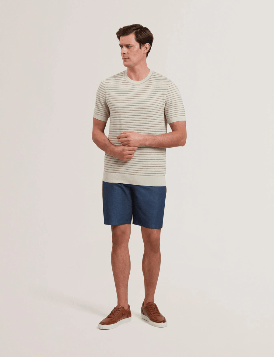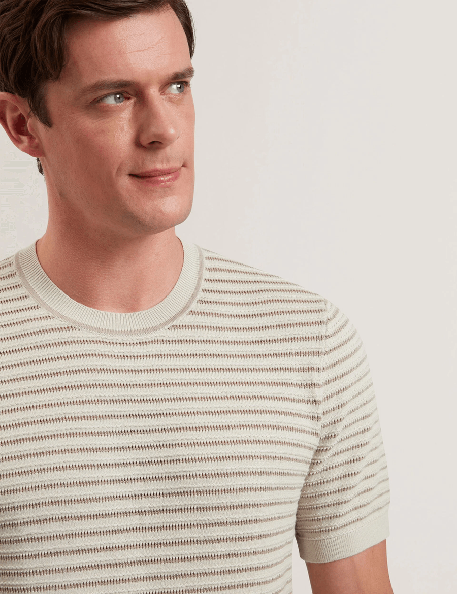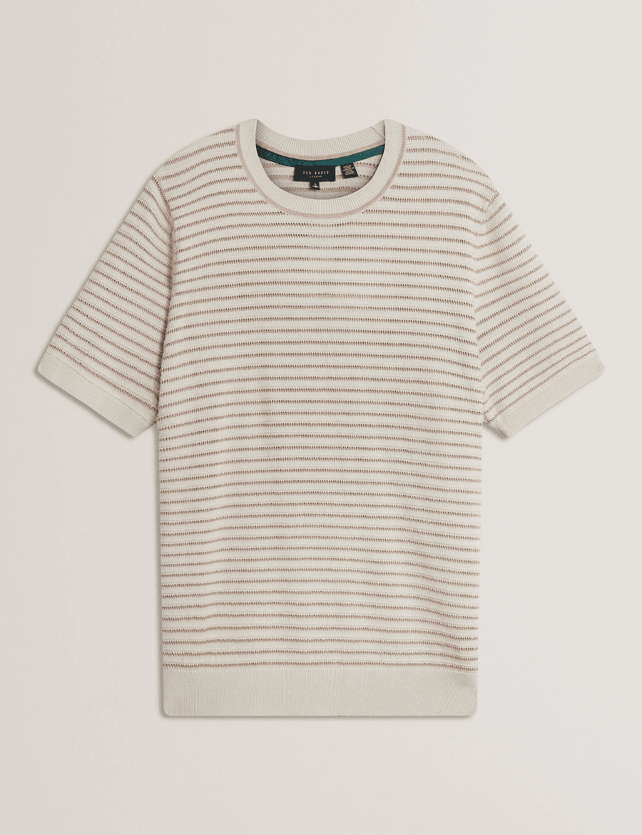 Discover the perfect blend of style and comfort with the Ted Baker LAIN | ECRU t-shirt. This eye-catching piece features a textured stripe design crafted from premium knitted cotton fabric, ensuring you look effortlessly chic while staying comfortable throughout the day.