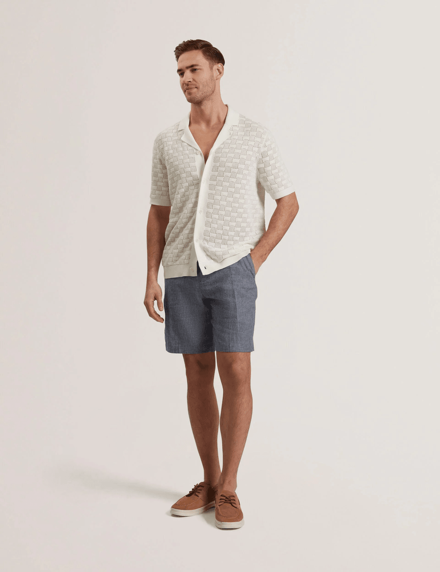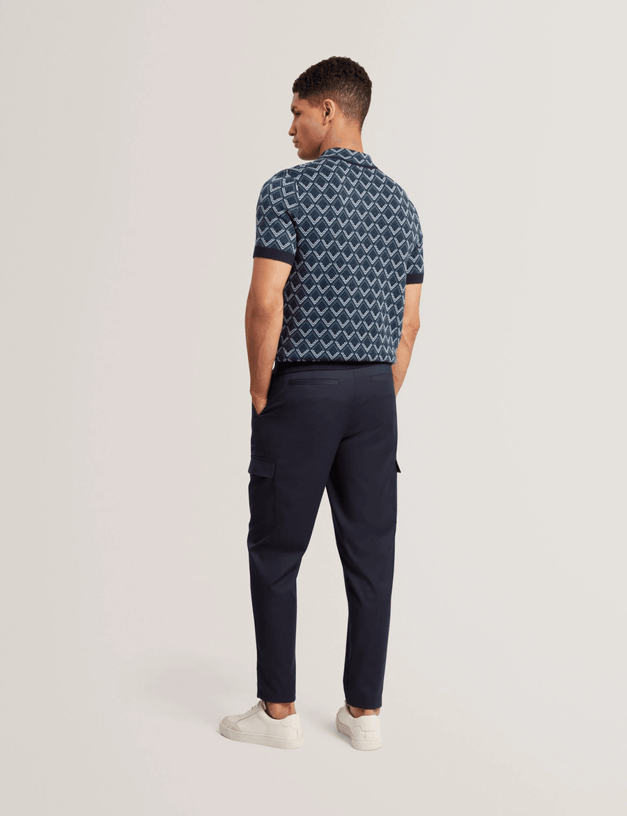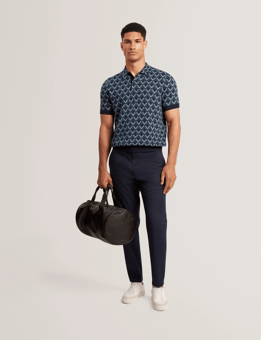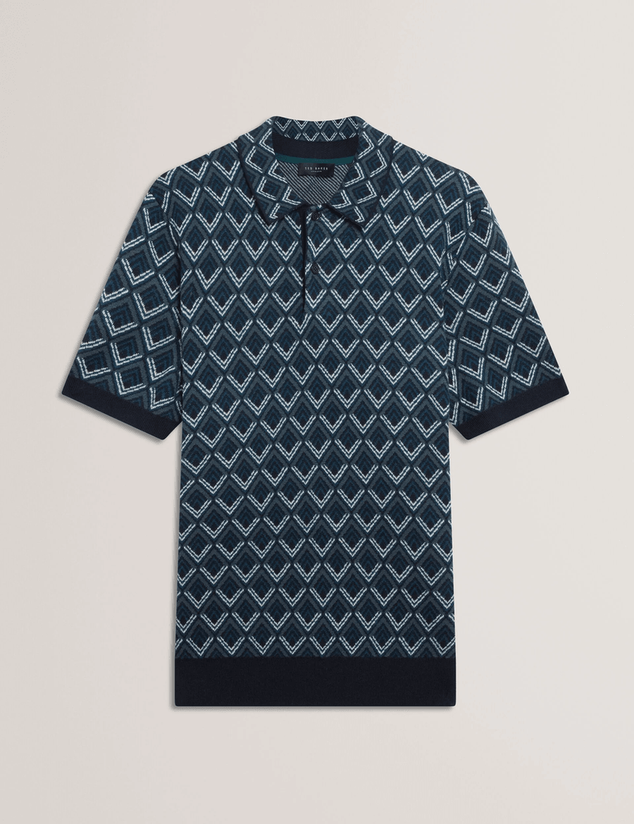 Elevate your wardrobe with the Ted Baker MELVVIN | NAVY, a stylish short sleeve polo shirt that combines elegance and comfort. Crafted from a luxurious wool blend, this shirt features a unique two-tone diamond pattern that effortlessly stands out, making it ideal for both casual and smart-casual settings.