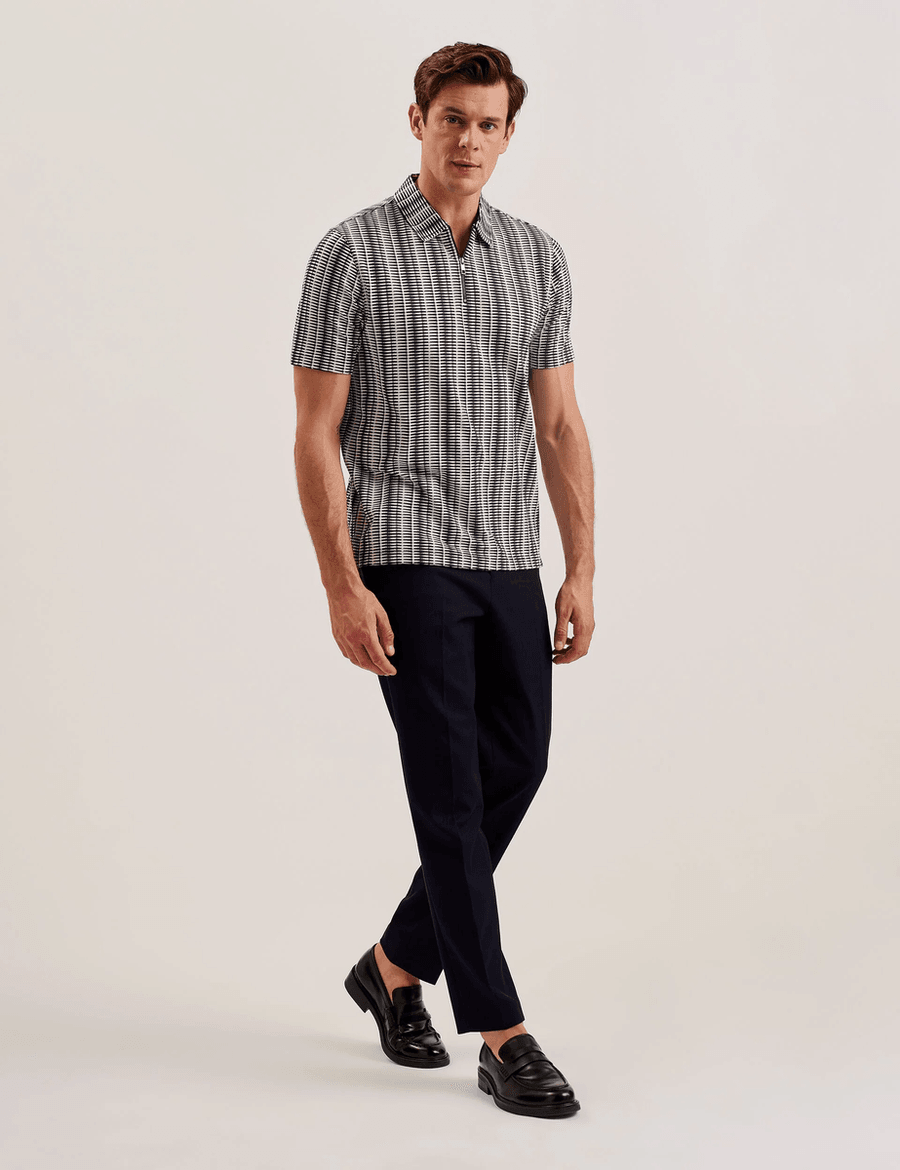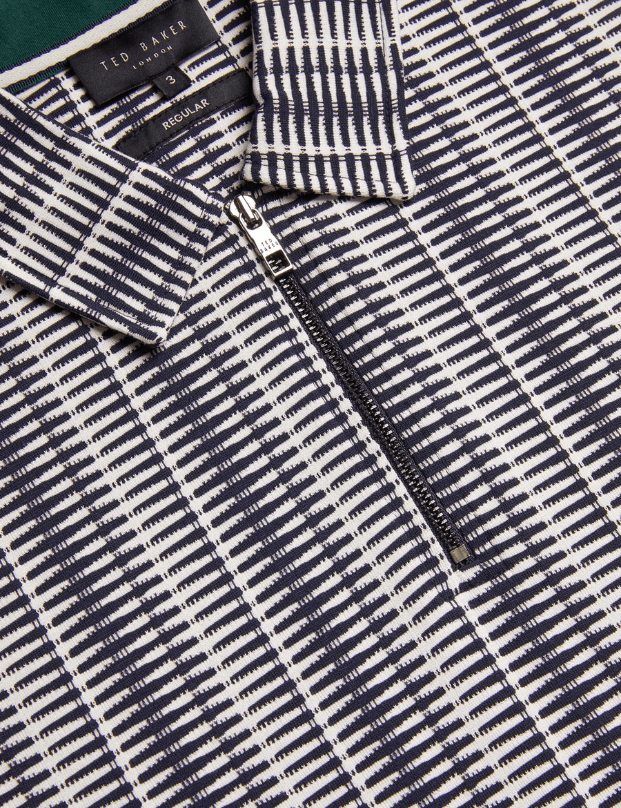 Discover the perfect blend of sophistication and comfort with the Ted Baker OCTON | NAVY polo shirt. Featuring a unique knitted texture and a striking geometric stripe pattern, this stylish shirt is designed to make a statement while ensuring you feel great all day long.