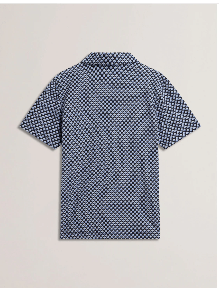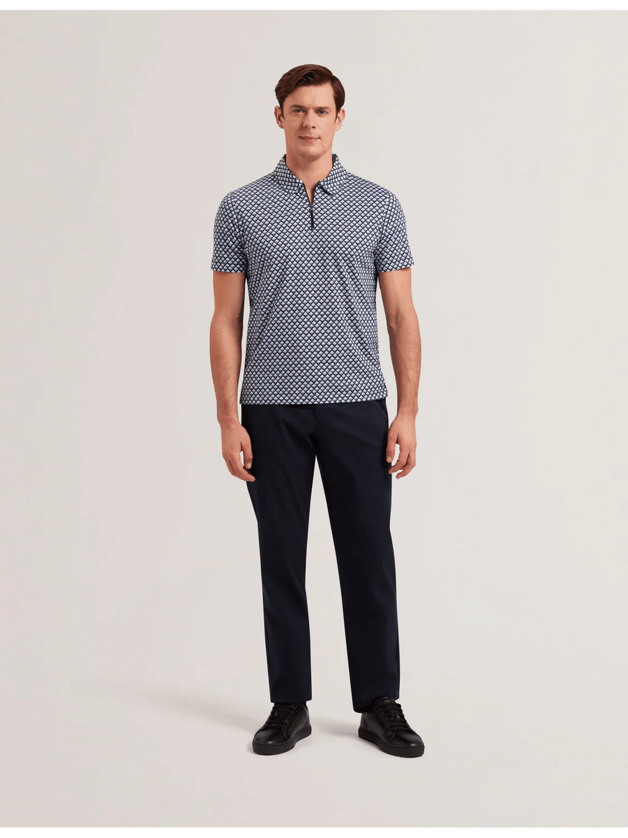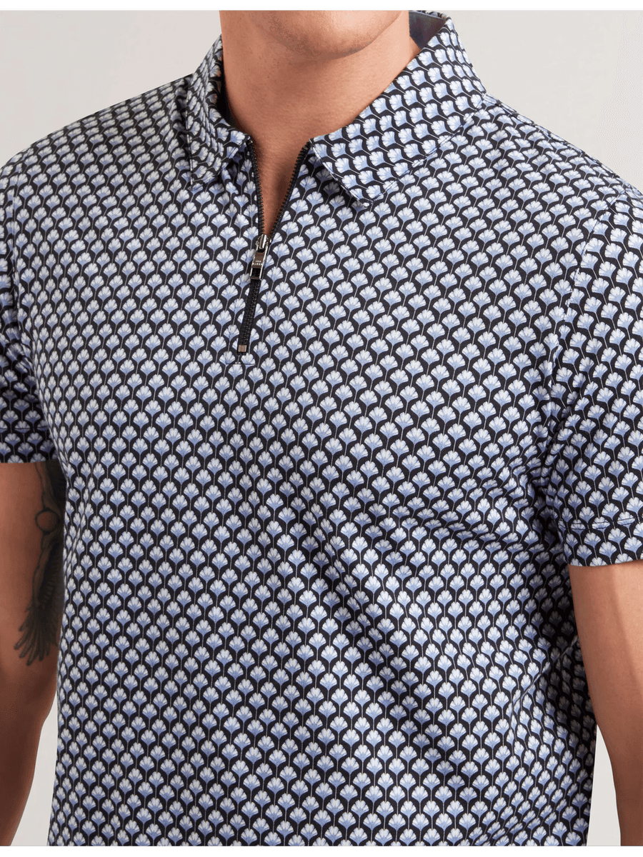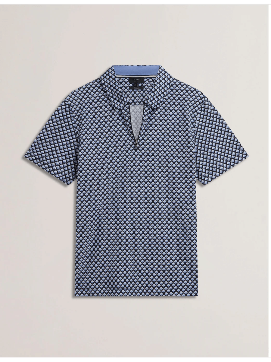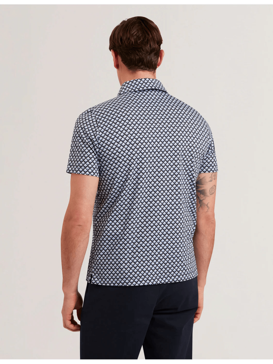 Discover the perfect blend of style and comfort with the Ted Baker OUNSLO | BLUE. This short sleeve polo features a stunning Art Deco fan print, making it an eye-catching addition to any casual outfit. Crafted from 100% cotton, it ensures a soft and breathable fit that you'll love wearing all day long.