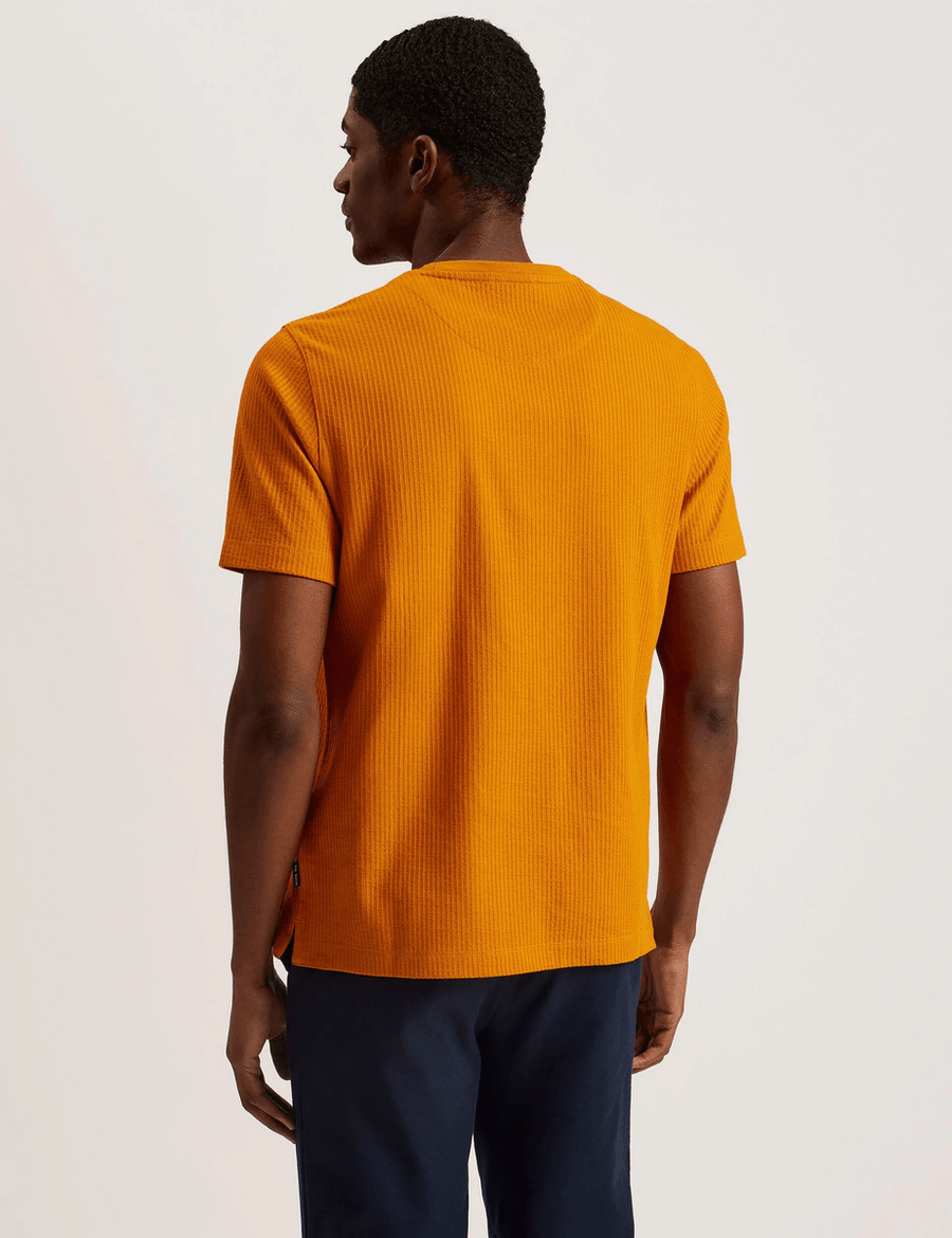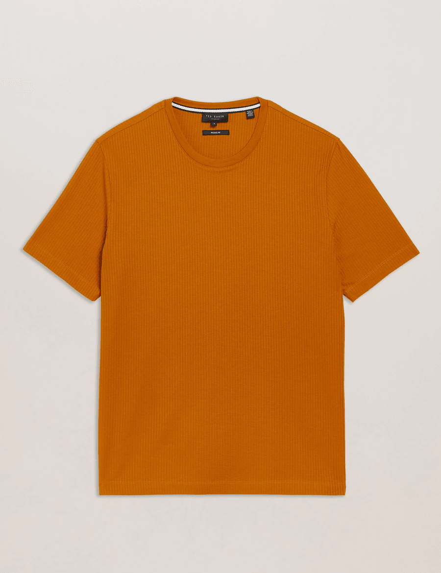 The Ted Baker RAKES | DK-ORANGE features a classic crew neck and short sleeves, making it an ideal choice for warm weather. The eye-catching striped texture adds depth and interest, setting it apart from standard tees. Model Joseph, standing at 6'1" (1.85m), showcases the perfect fit in a Ted size 3, illustrating how this tee complements various body types.