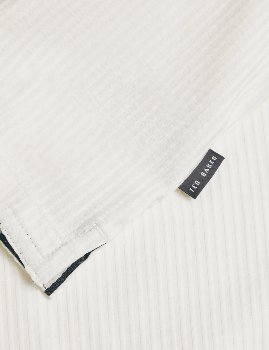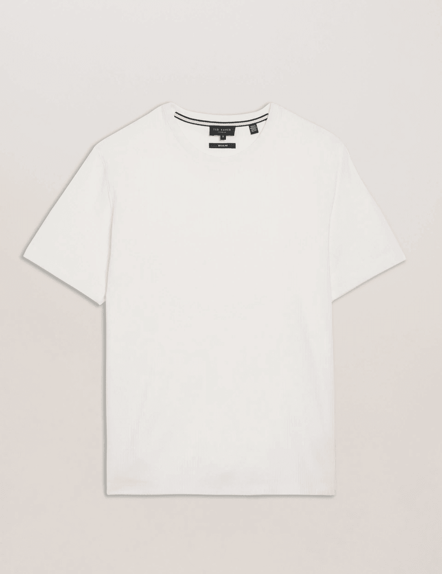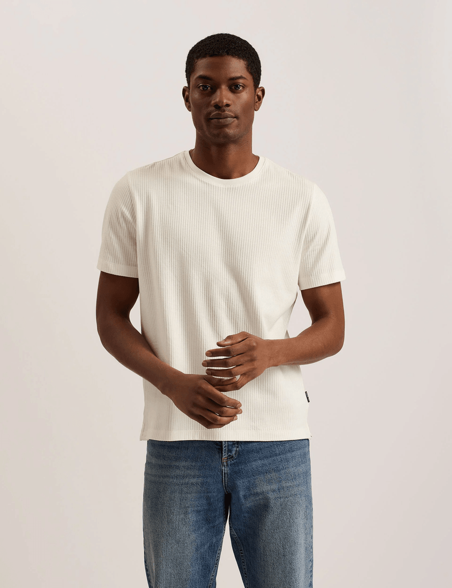 Discover the ultimate in casual elegance with the Ted Baker RAKES | WHITE tee. This wardrobe staple is crafted from 100% cotton, ensuring a soft touch and breathable comfort for all-day wear. The stylish striped texture adds a unique flair, making it perfect for any occasion.