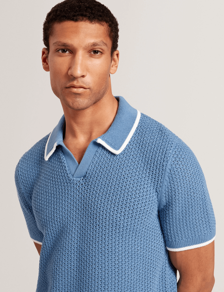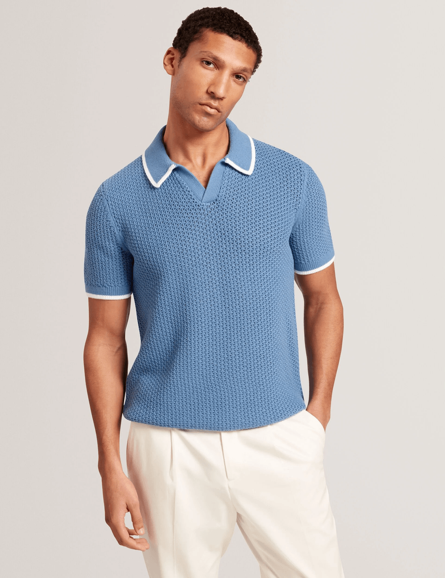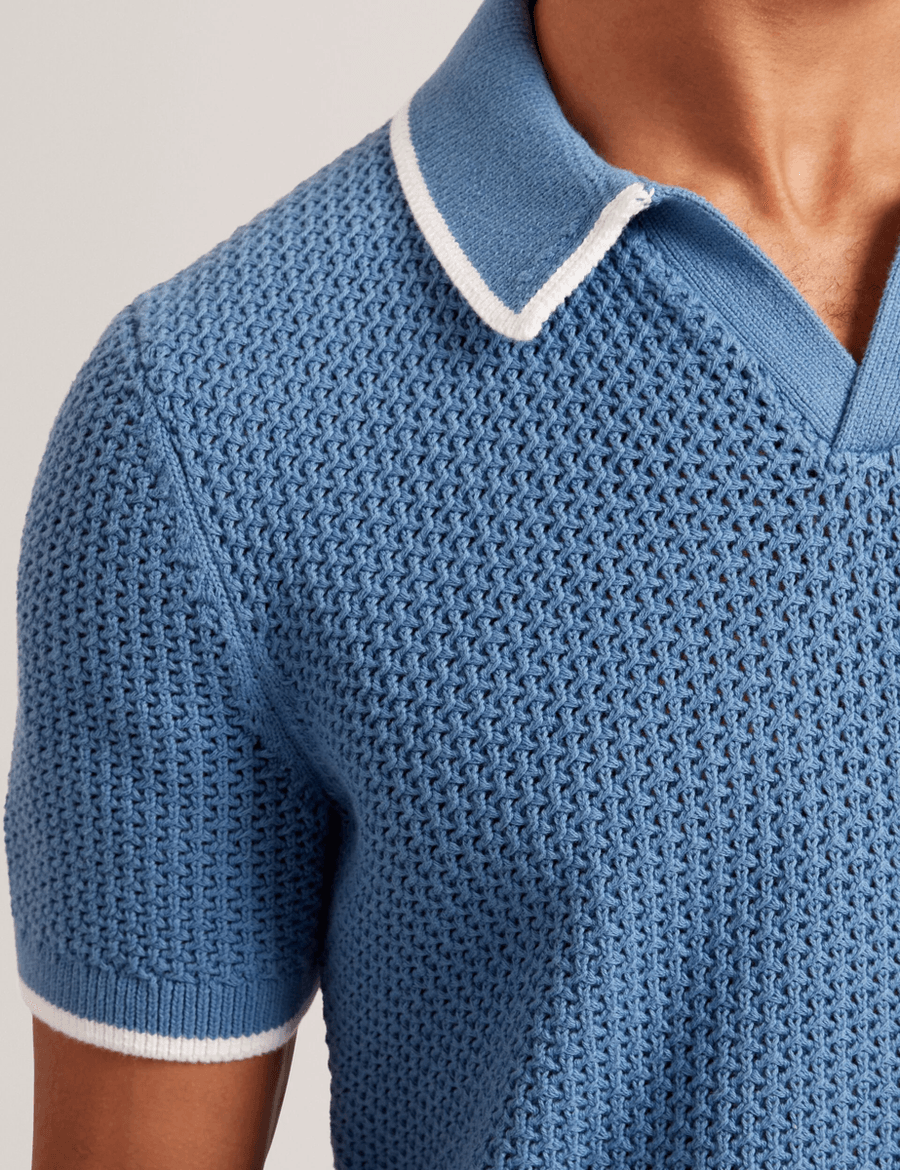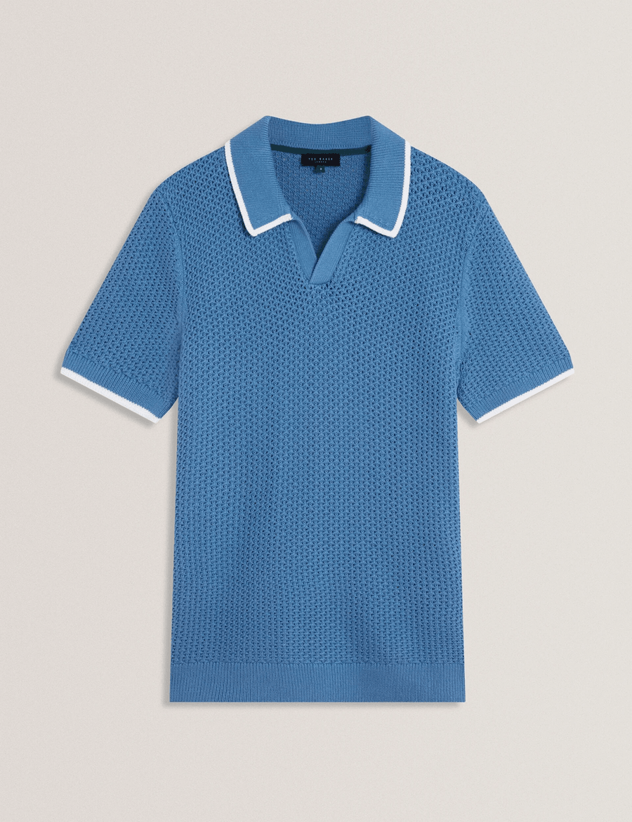 Discover the ultimate blend of comfort and sophistication with the Ted Baker SACHAIR | LT-BLUE short sleeve polo shirt. Crafted from 100% cotton, this polo features a textured interlocking stitch knit that ensures breathability and a soft touch against your skin. Perfect for casual outings or smart-casual events, this stylish piece is a must-have for your wardrobe.
