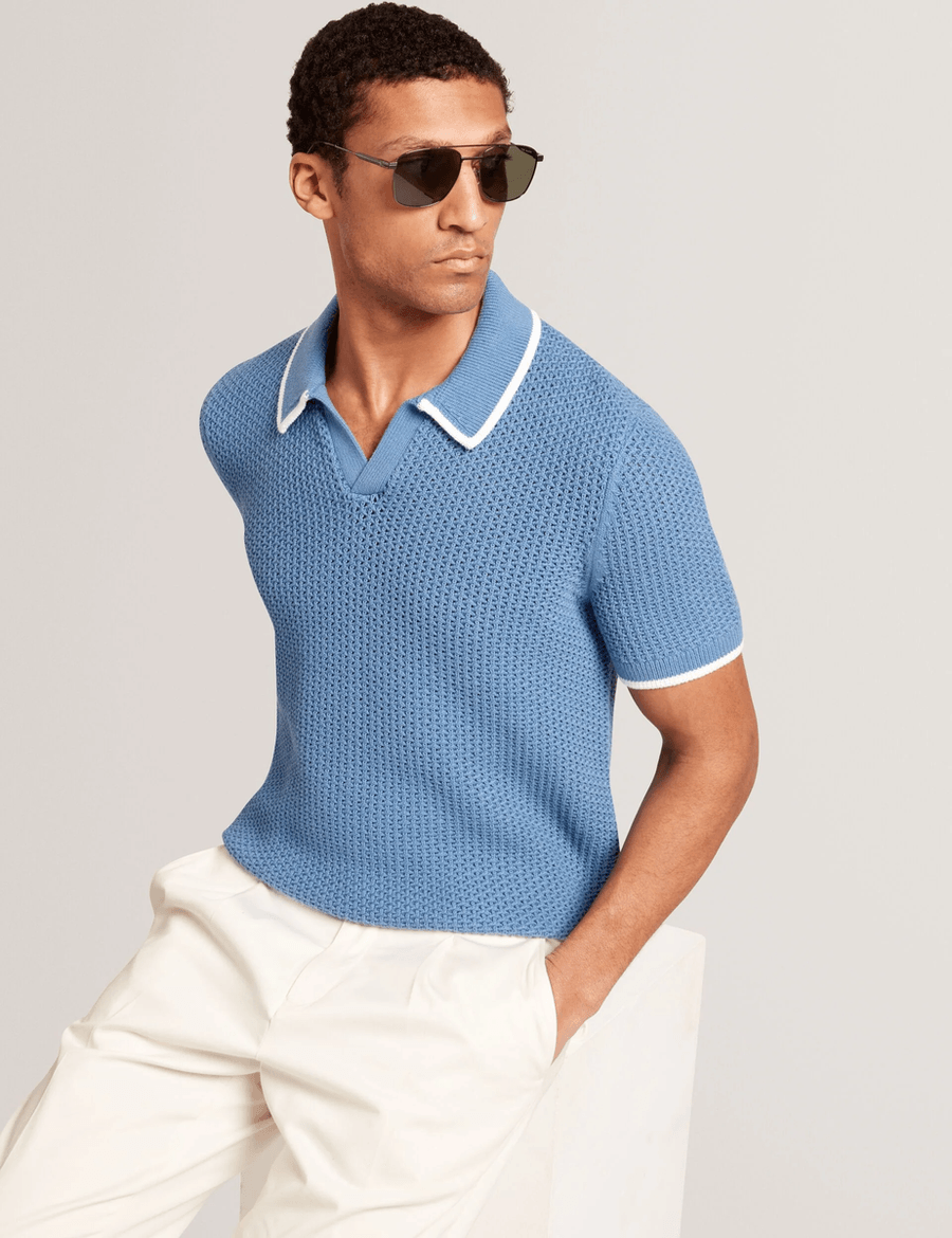 Yann, who stands at 6'1.5" (1.87m), showcases the light blue version in a Ted size 3, demonstrating how this polo fits perfectly for taller frames as well. Pair it with chinos or shorts for a laid-back look, or dress it up with tailored trousers.
