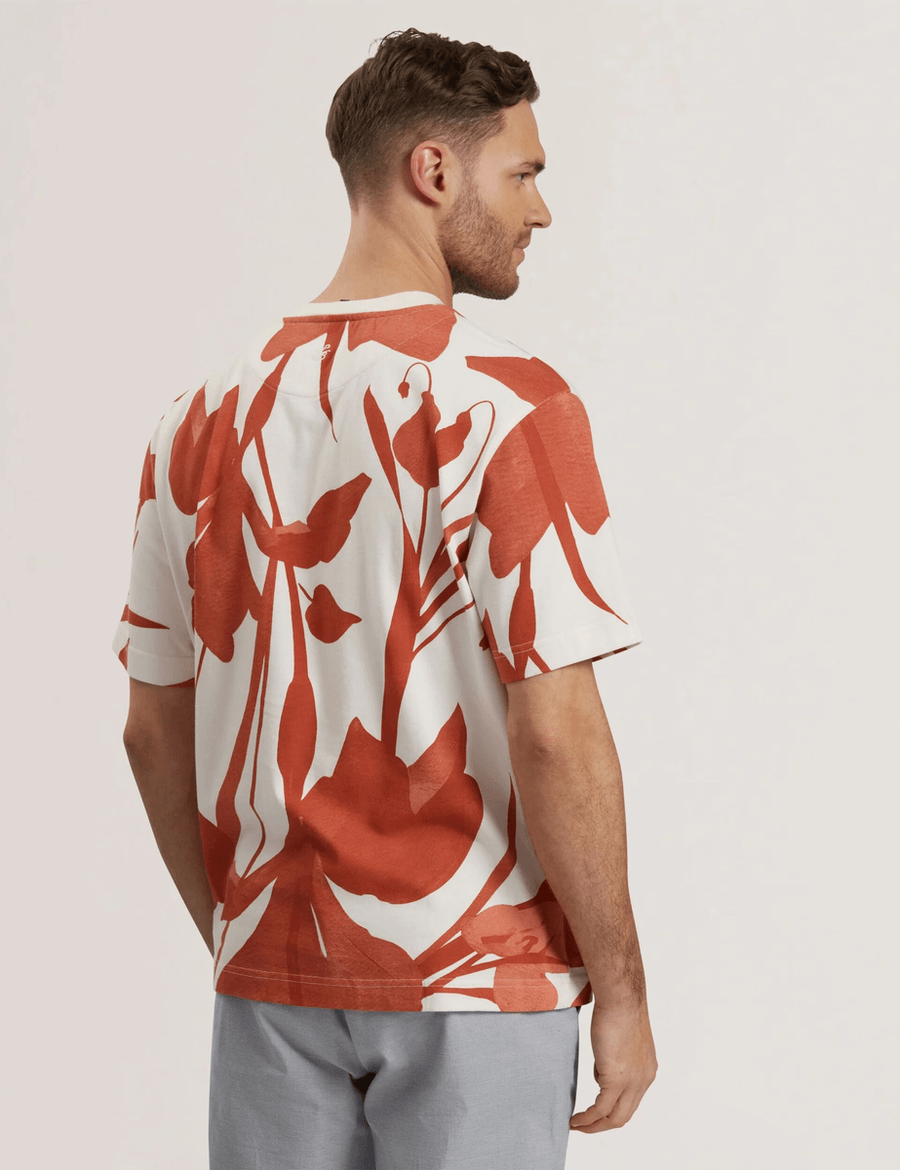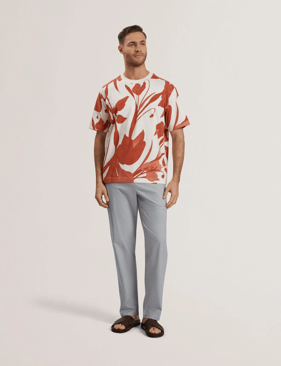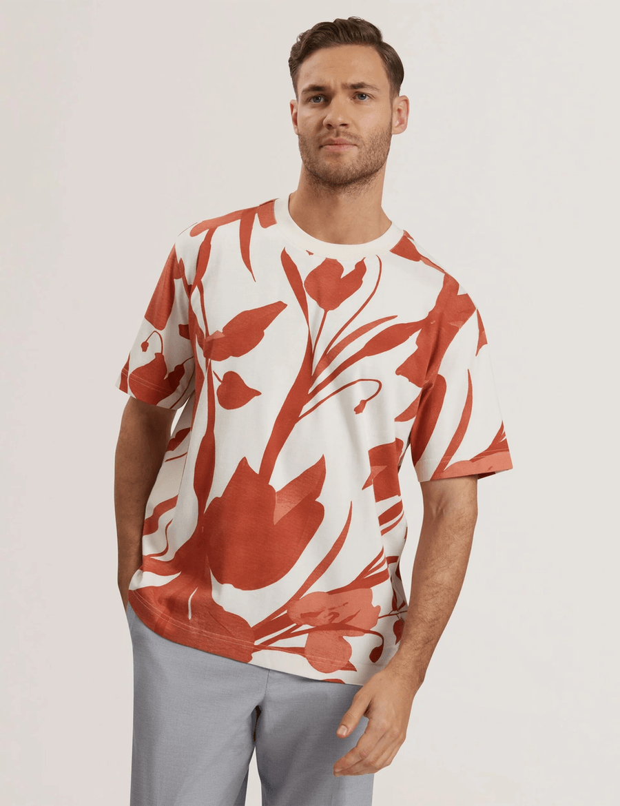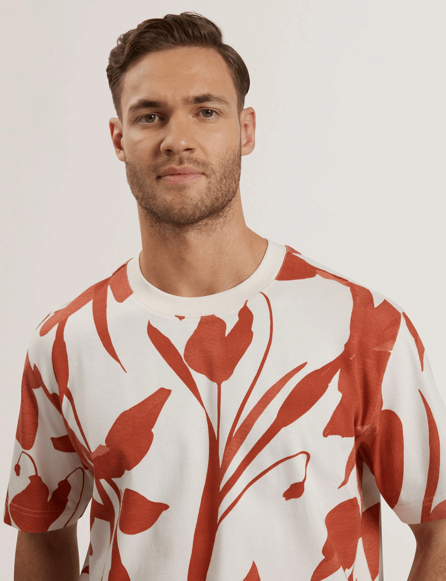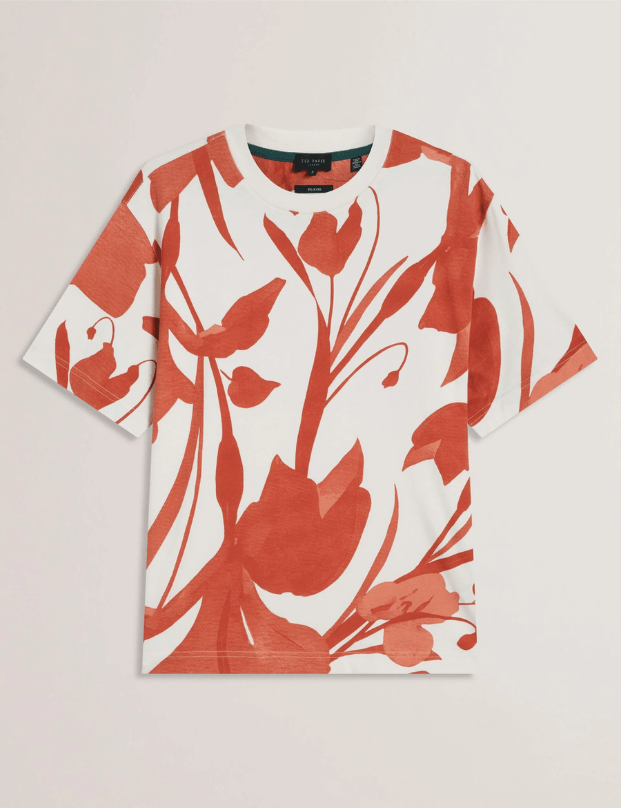 Discover the perfect blend of style and comfort with the Ted Baker YIANNOS | RED t-shirt. This striking piece features a large-scale floral print that adds a touch of sophistication to any outfit. Made from 100% BCI cotton, this heavyweight fabric ensures durability while providing a soft, luxurious feel against your skin.