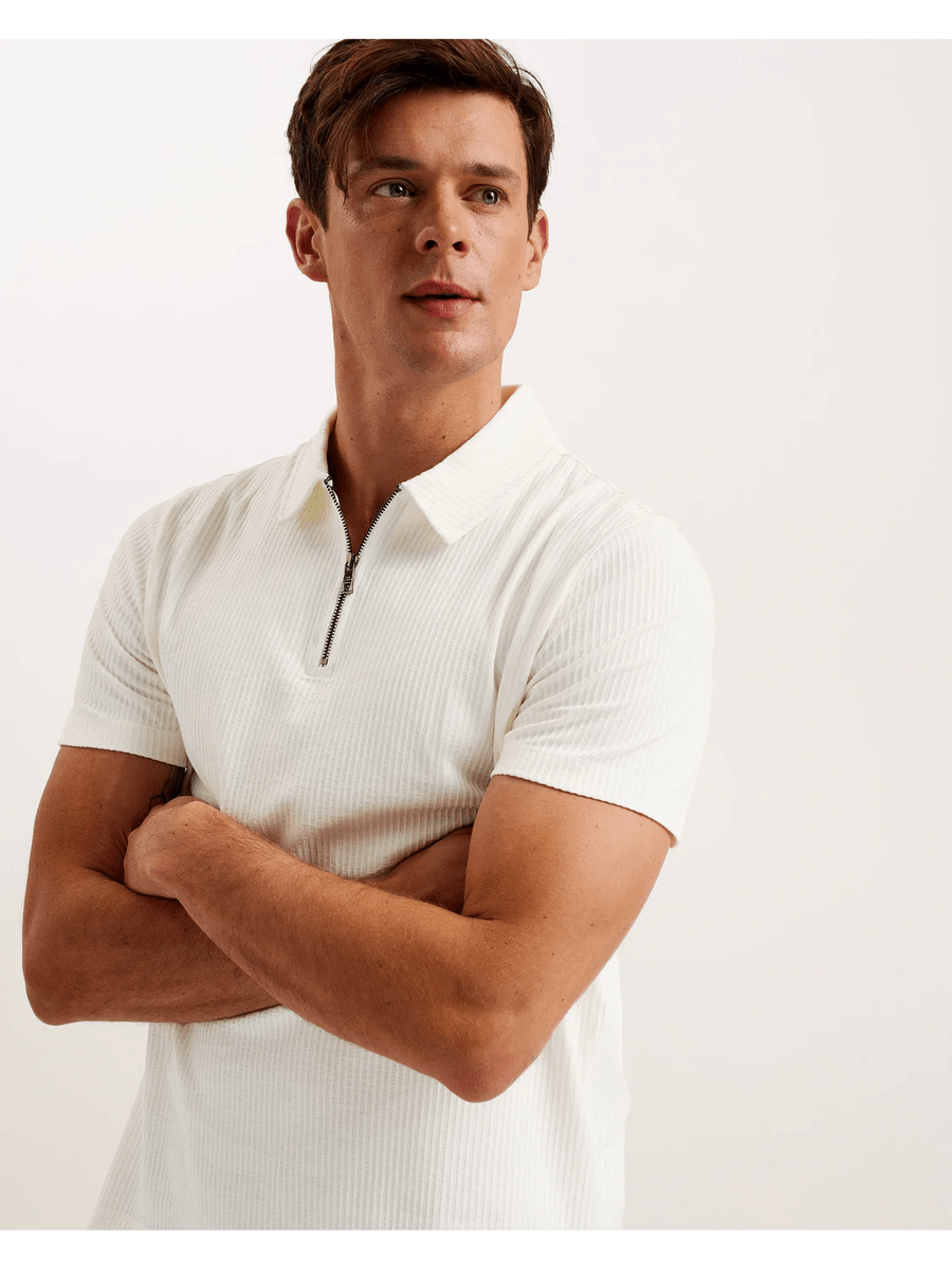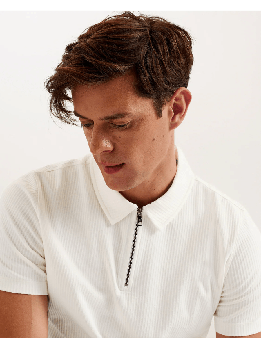 The Ted Baker ZARKES | WHITE is more than just a polo; it’s a statement. The innovative zip neck design allows you to adjust your style to suit any occasion, whether you’re heading to the office or enjoying a weekend outing. Its ribbed texture not only enhances its visual appeal but also provides added comfort throughout the day.