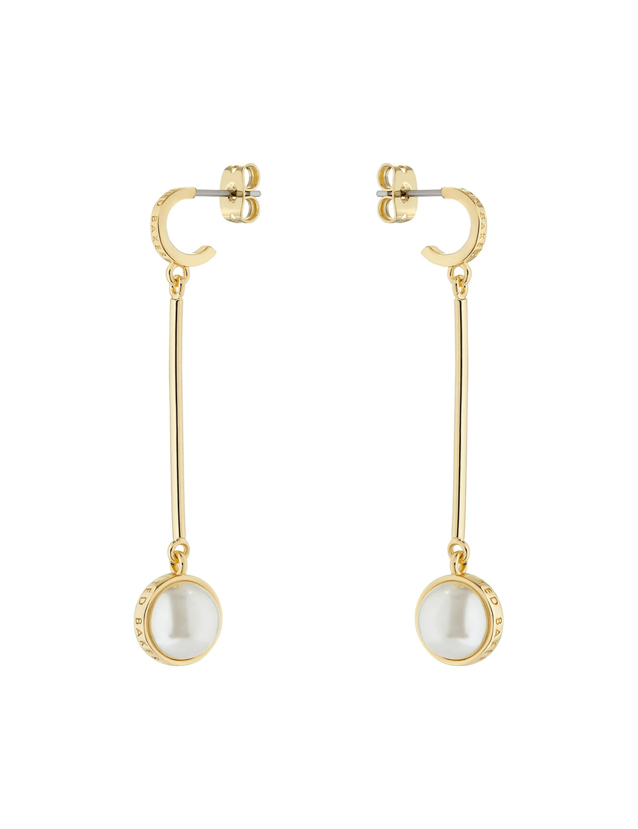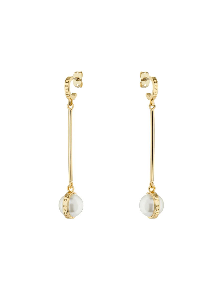 Discover the stunning Ted Baker PERLLIE | GOLD earrings, designed to add a touch of sophistication to any outfit. These long drop earrings feature a beautiful faux pearl bead pendant that captures light beautifully, making them the perfect accessory for any occasion.