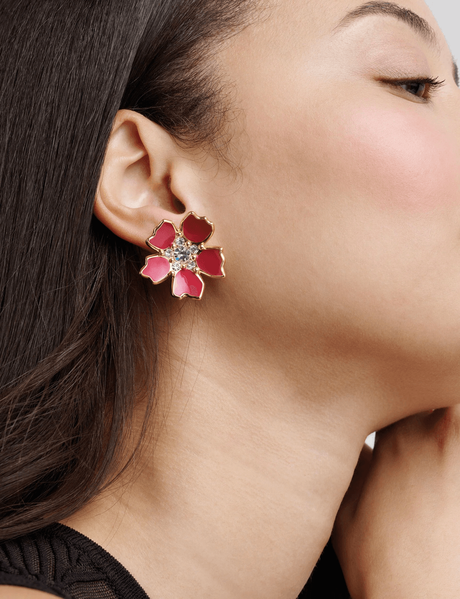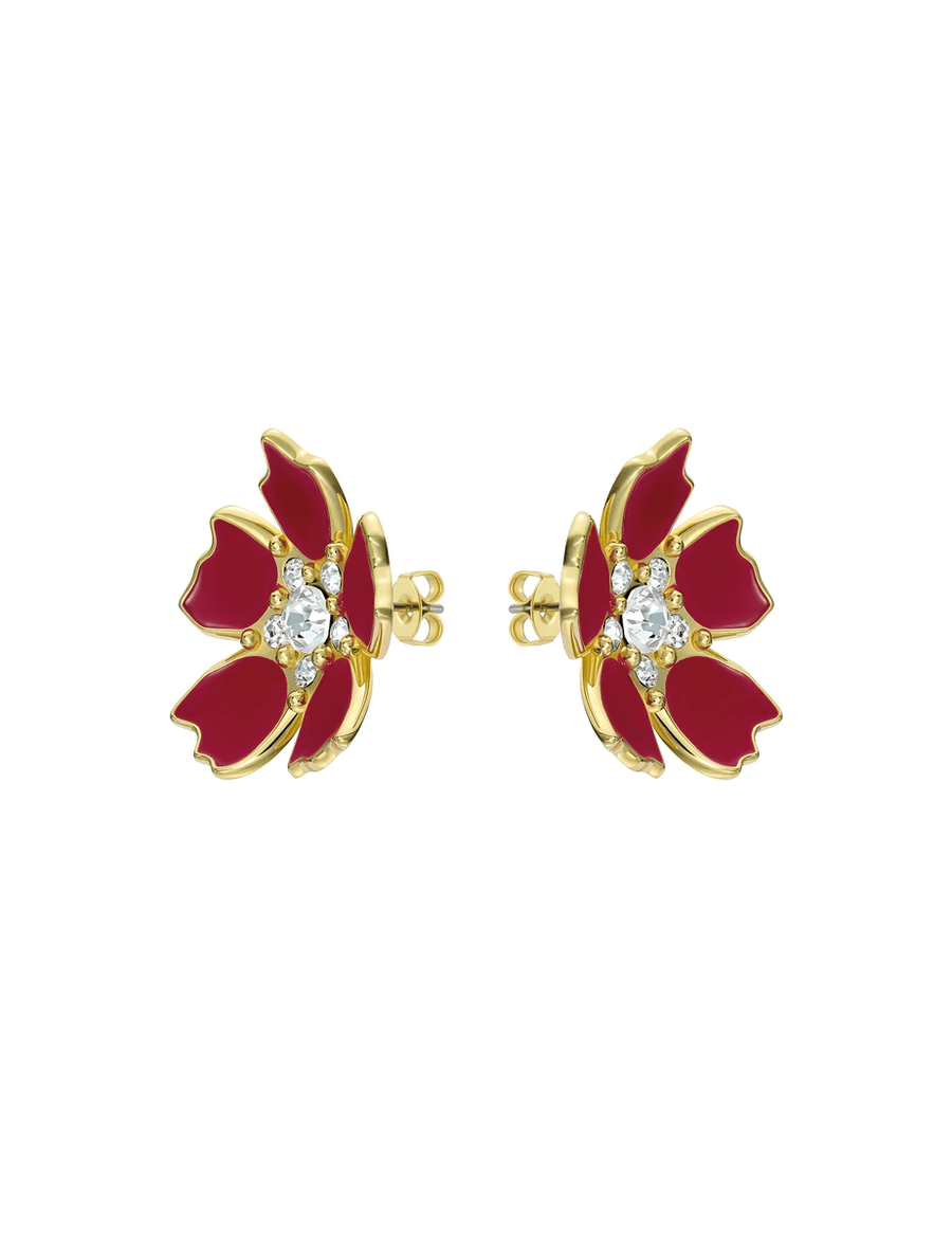 The Ted Baker PETINNA | GOLD earrings are not just accessories; they are a statement piece that enhances your style. Measuring 3cm in height and width, these earrings are beautifully crafted with gold-tone plating that adds a touch of luxury. The rich raspberry pink enamel flower design is complemented by a stunning clear crystal stone at the center, making them perfect for elevating your evening wear or adding flair to your daytime outfit.