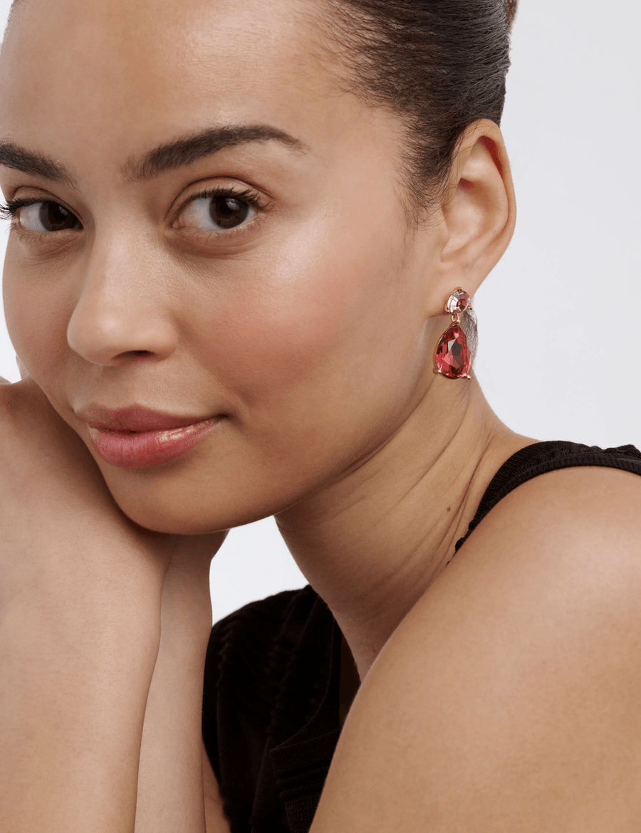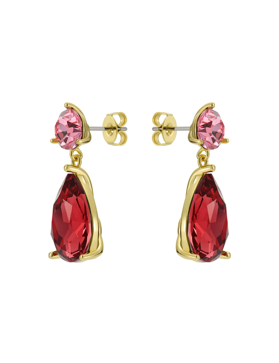 Discover the stunning beauty of the Ted Baker TEAIRE | RUBY earrings, where elegance meets vibrant color. These drop earrings feature a brilliant pink round-cut stone paired with a deep red teardrop crystal, creating a captivating look that adds a touch of radiance to any outfit.
