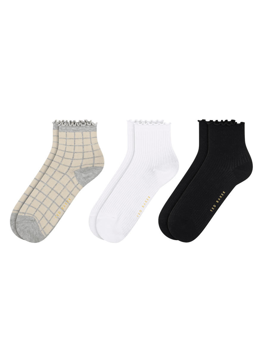 The Ted Baker RUFFLE ANKLET | MID-GREY is more than just a sock; it’s a fashion statement. This three-pack includes two plain ribbed pairs and one eye-catching grid check design, perfect for mixing and matching with your favorite outfits. The ruffled cuff adds a feminine flair, making these ankle socks ideal for both casual and dressy occasions.