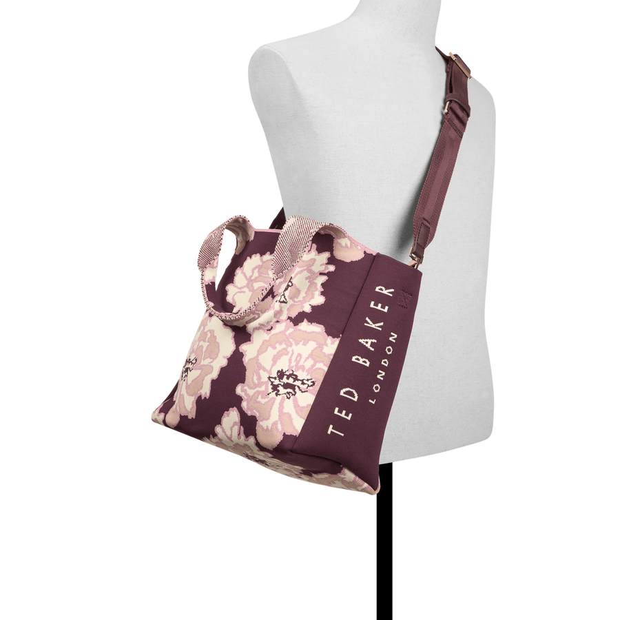 Introducing the Ted Baker SARA | BURGUNDY, a stunning tote bag crafted from luxurious jacquard knit fabric. This exquisite accessory combines functionality and elegance, making it the perfect companion for any occasion.