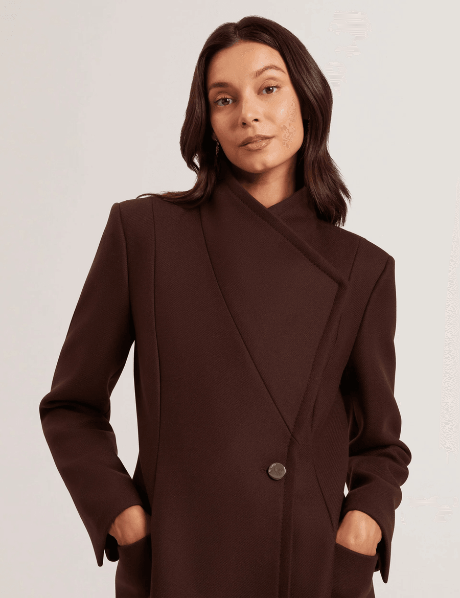 The Ted Baker MINDEE | DK-BROWN coat is designed for the modern woman who values both style and comfort. This sophisticated longline wrap coat showcases a sculpted hourglass shape, ensuring you look your best while staying warm. The luxurious double-faced wool blend not only provides exceptional warmth but also feels incredibly soft against the skin.