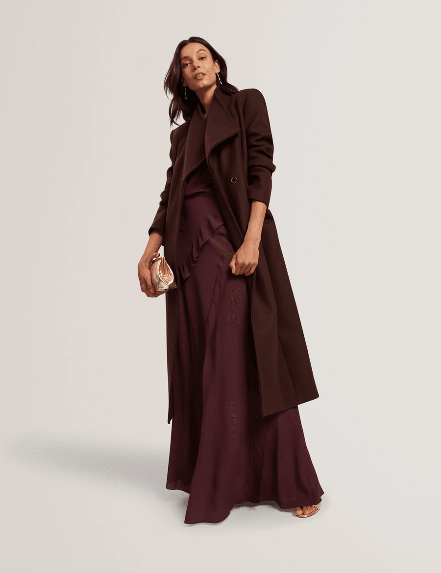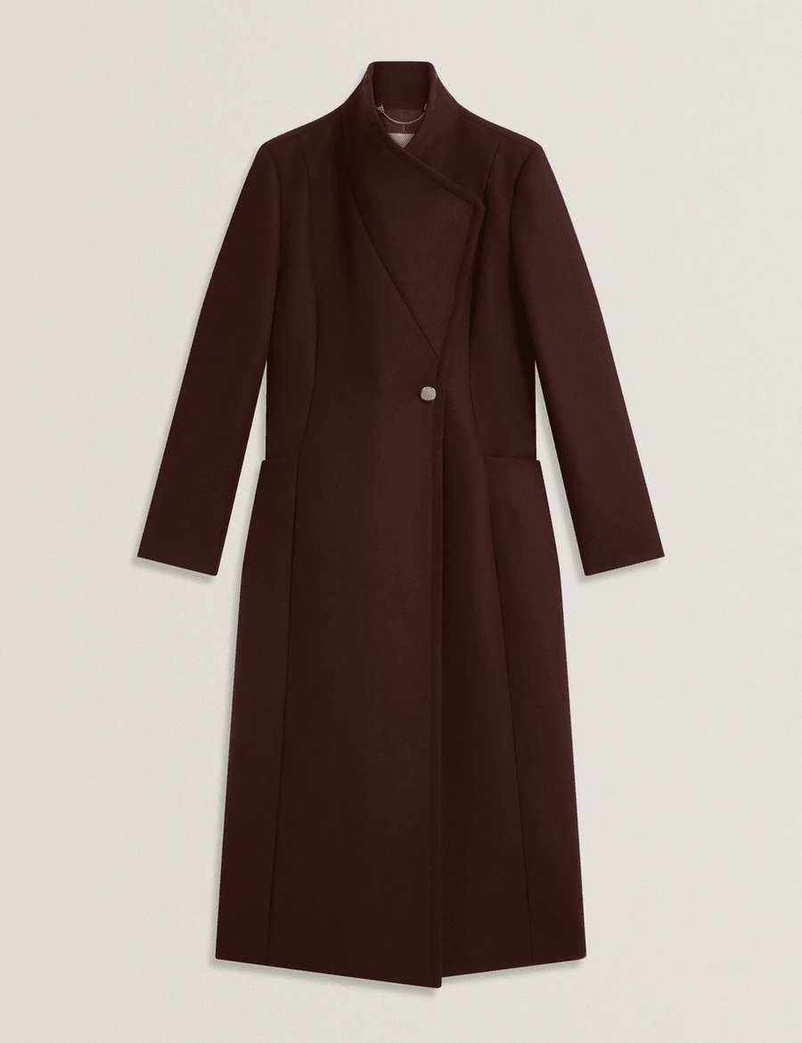 Introducing the Ted Baker MINDEE | DK-BROWN, a stunning addition to your winter collection. This longline wrap coat combines elegance and warmth, making it the perfect choice for stylish layering during the colder months.