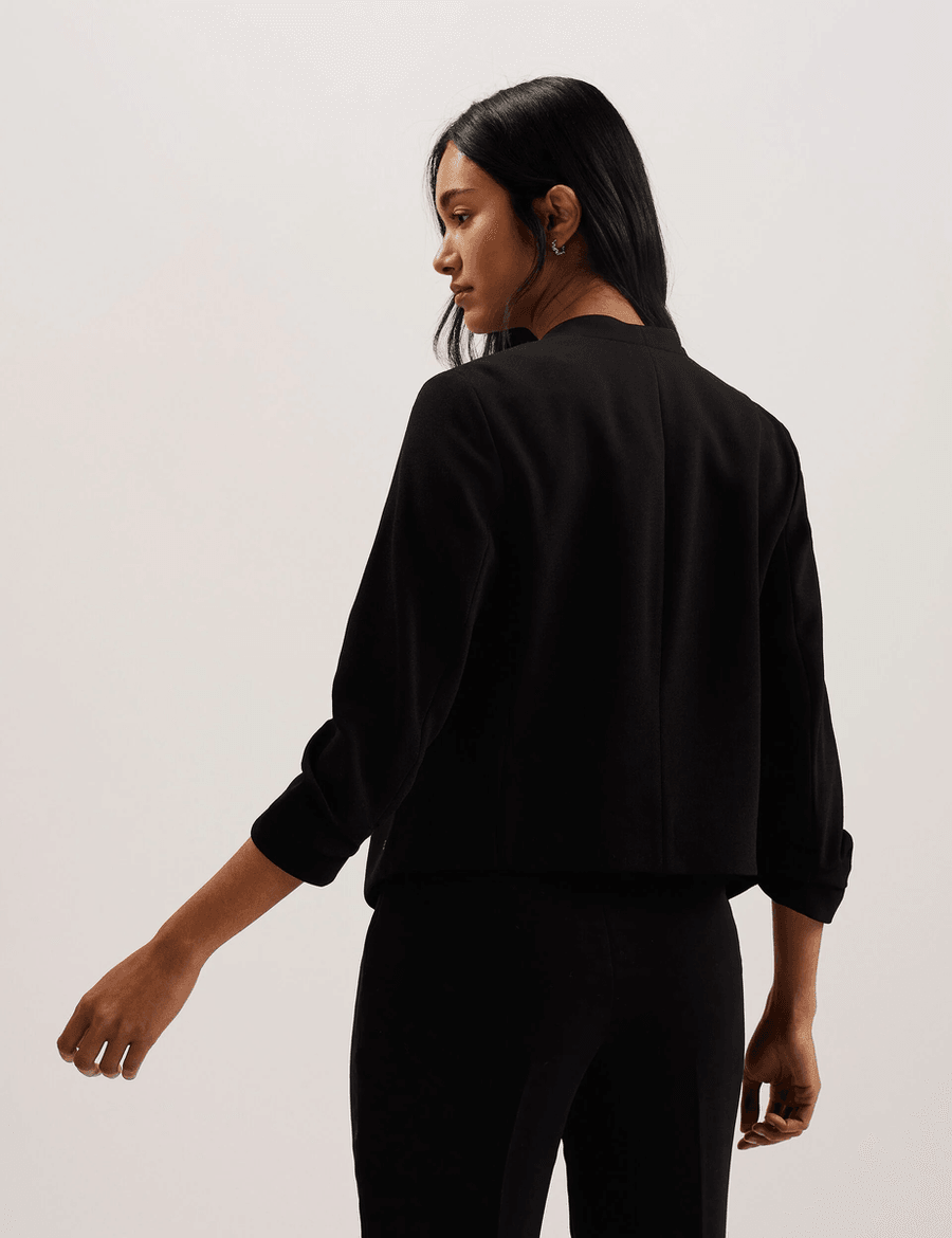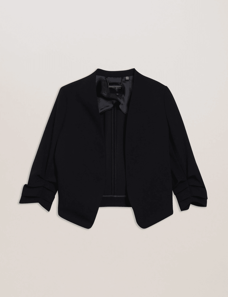 The Ted Baker POPSY | BLACK is not just a jacket; it's a statement piece. With its 3/4 sleeves and ruched detailing, this tailored jacket elevates your look for both casual and formal occasions. The asymmetric front hem enhances your silhouette, making it a versatile addition to your wardrobe.