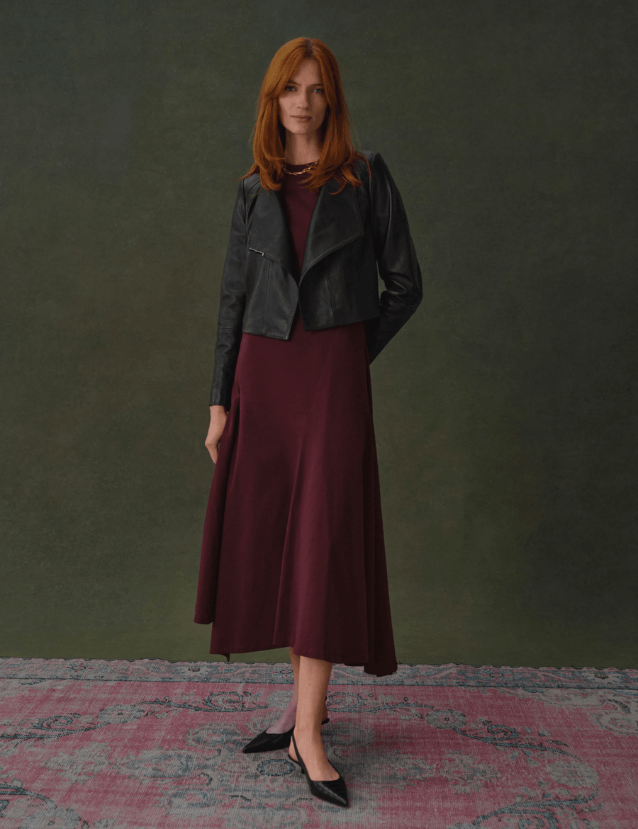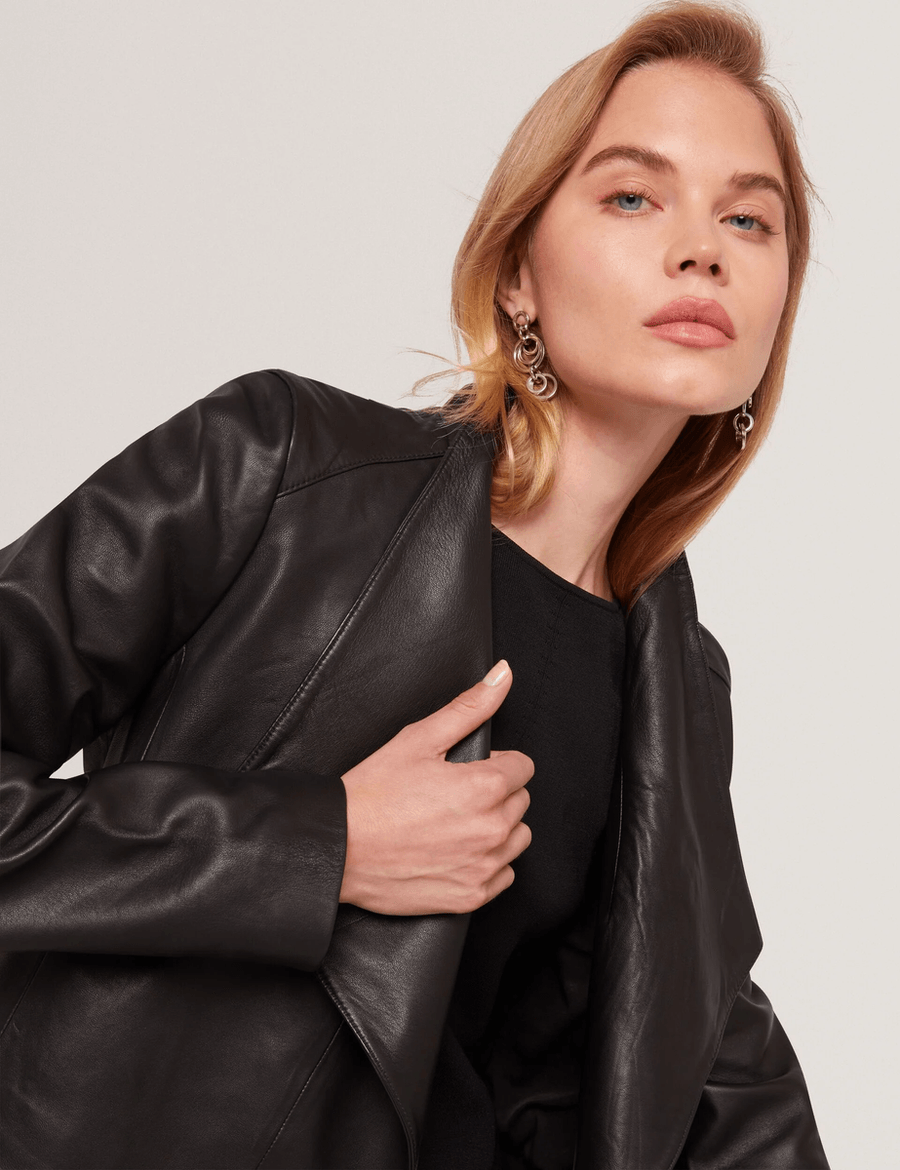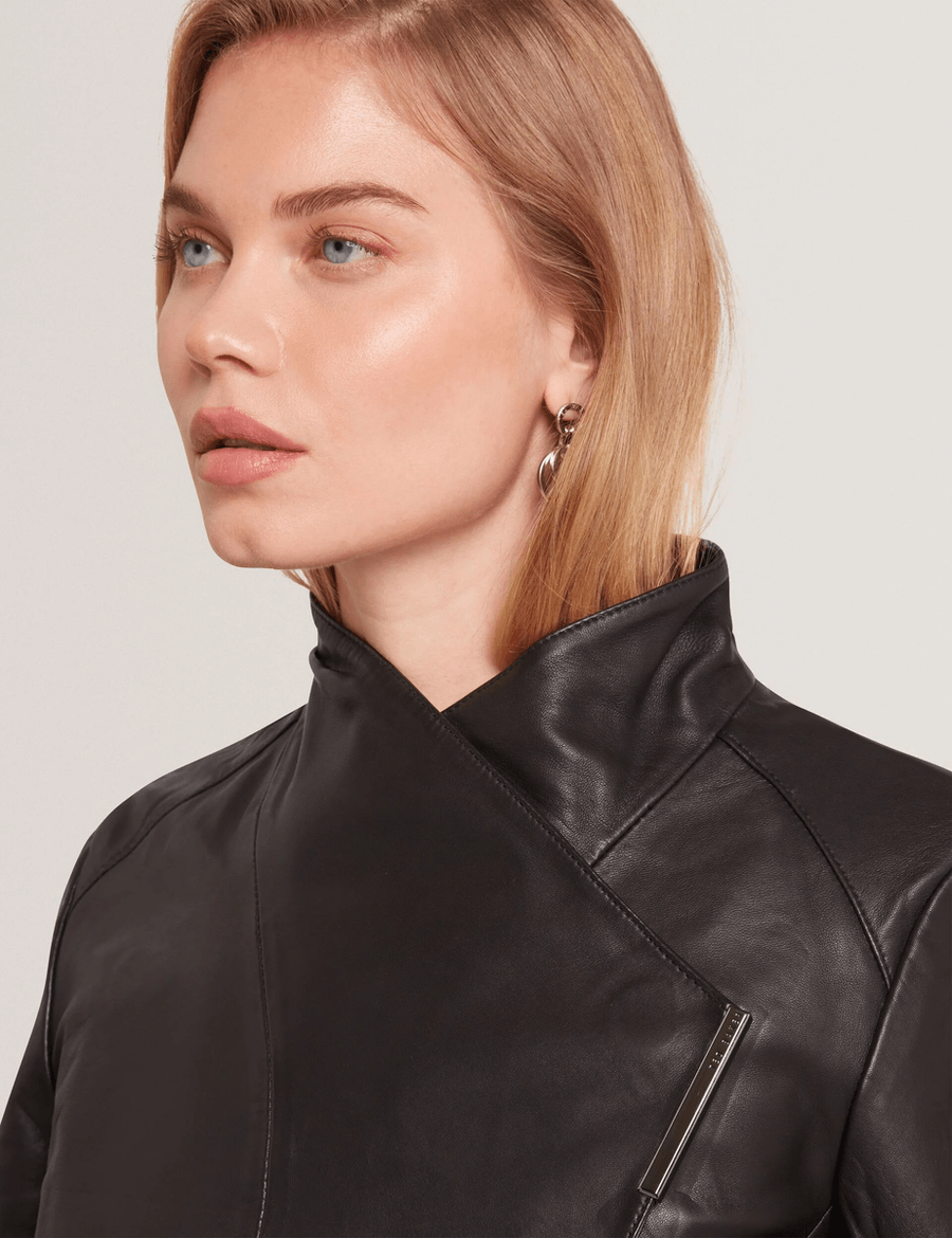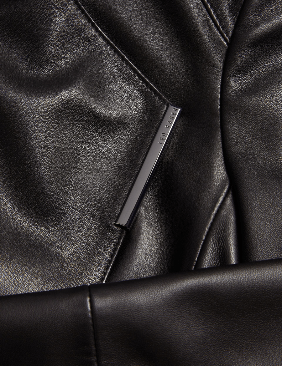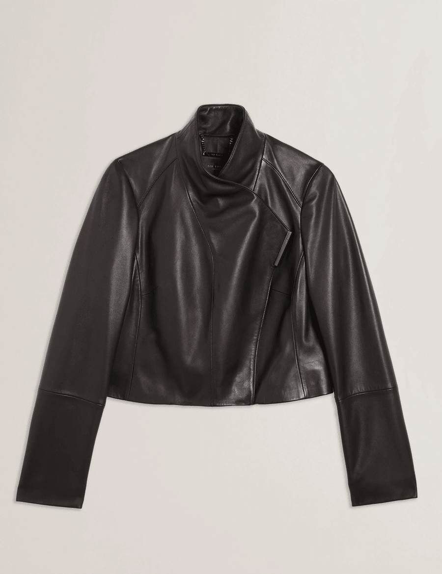 Discover the ultimate in chic outerwear with the Ted Baker RIYOZE | BLACK. This stunning leather jacket redefines sophistication with its sleek wrap front design and foldable funnel collar, making it a must-have addition to your wardrobe.