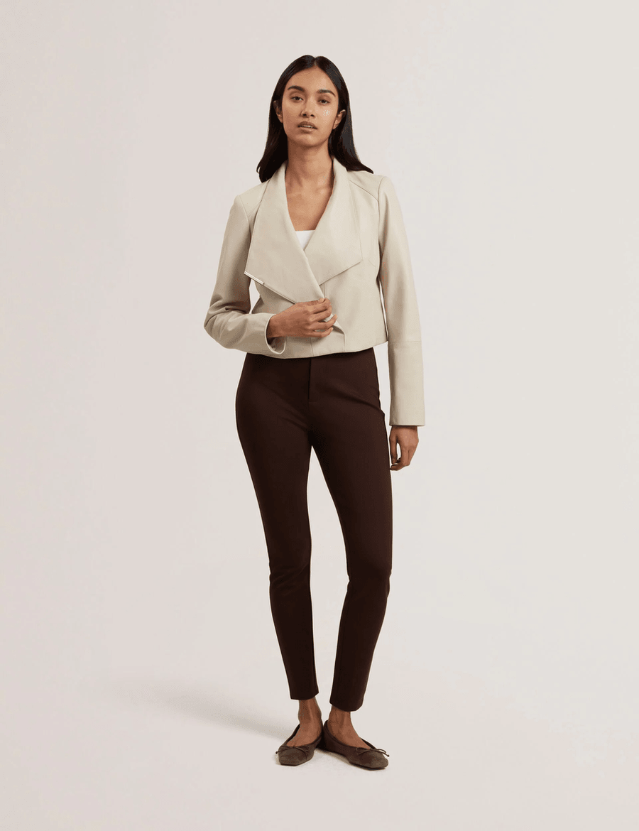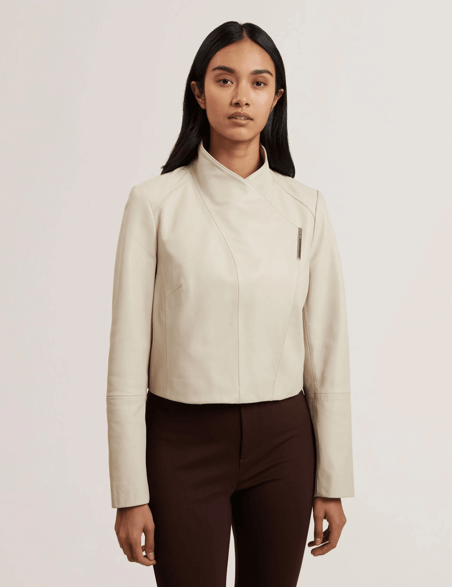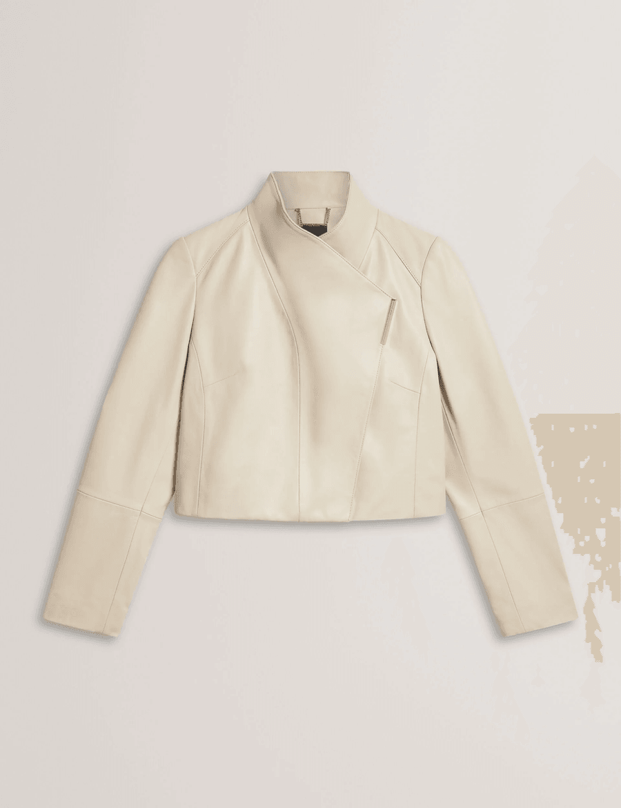 Discover the perfect blend of style and sophistication with the Ted Baker RIYOZE | IVORY. This elegant leather jacket redefines classic outerwear with its sleek wrap front design and foldable funnel collar, making it a must-have addition to your wardrobe.