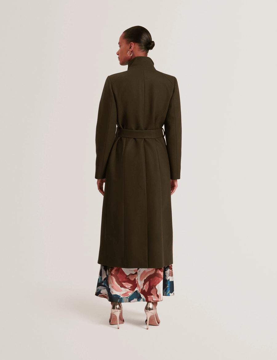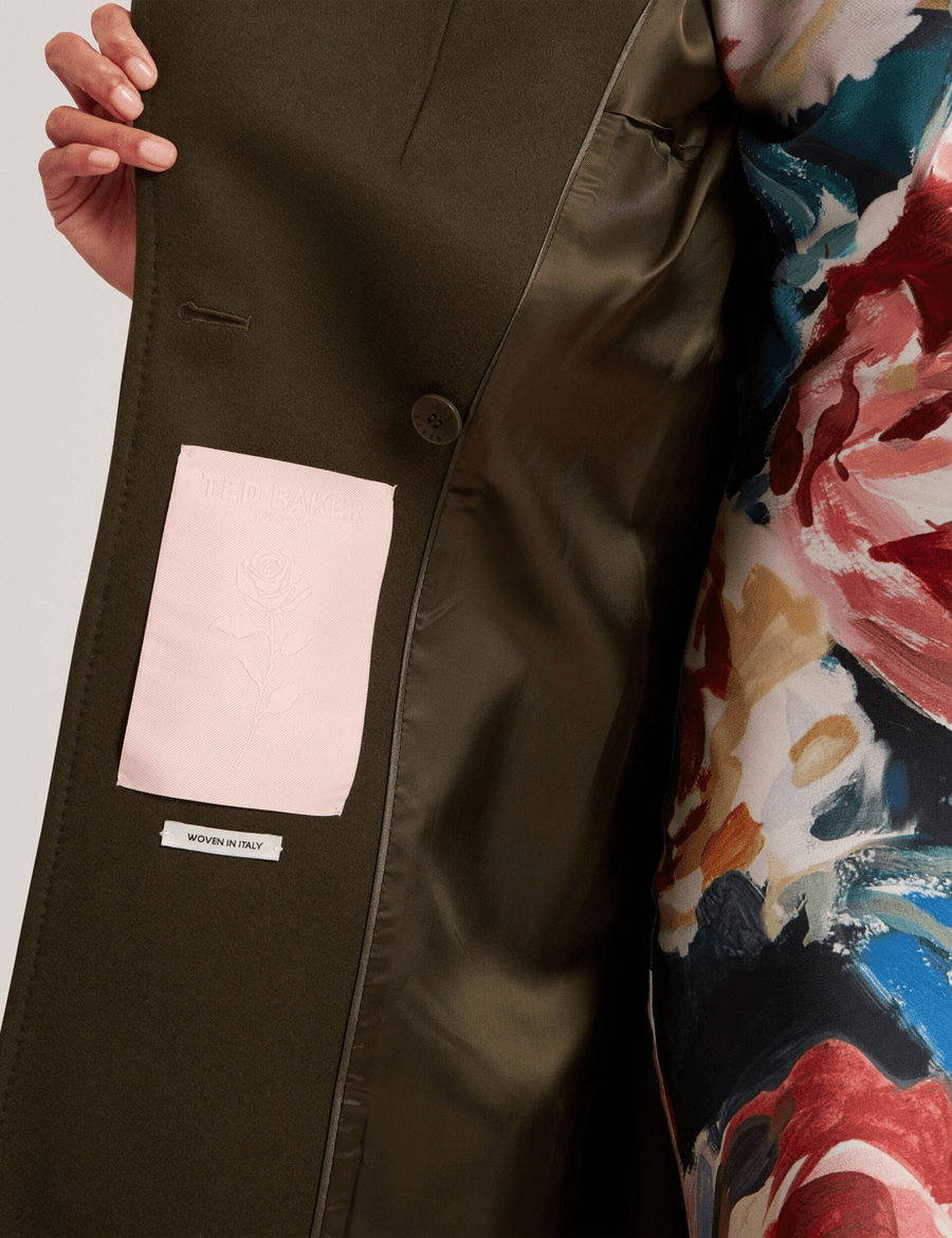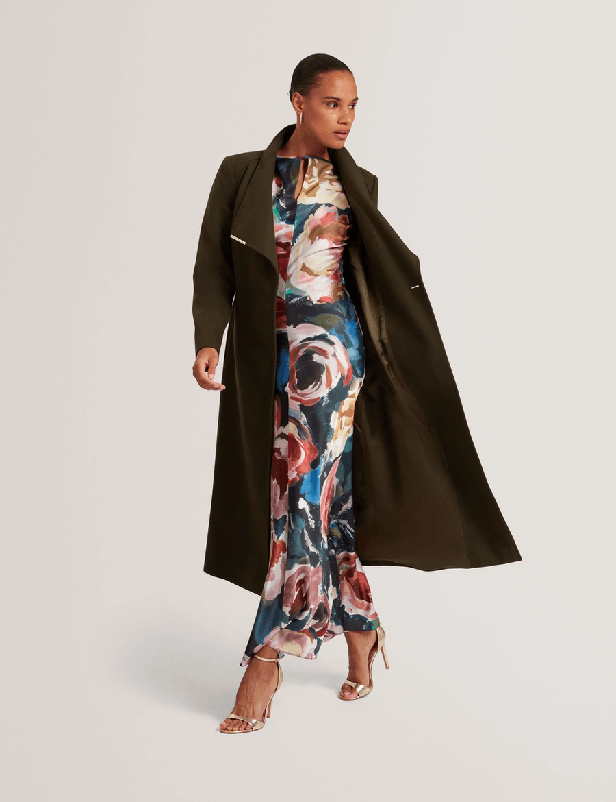 Wrap yourself in elegance with the Ted Baker ROSELL | DK-GREEN. This stunning longline coat is crafted from a luxurious blend of wool and cashmere, designed to keep you warm while making a fashion statement. With its sleek silhouette and sophisticated details, the ROSELL coat is a must-have for any wardrobe.