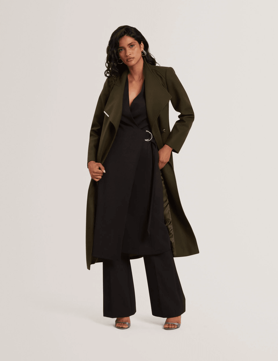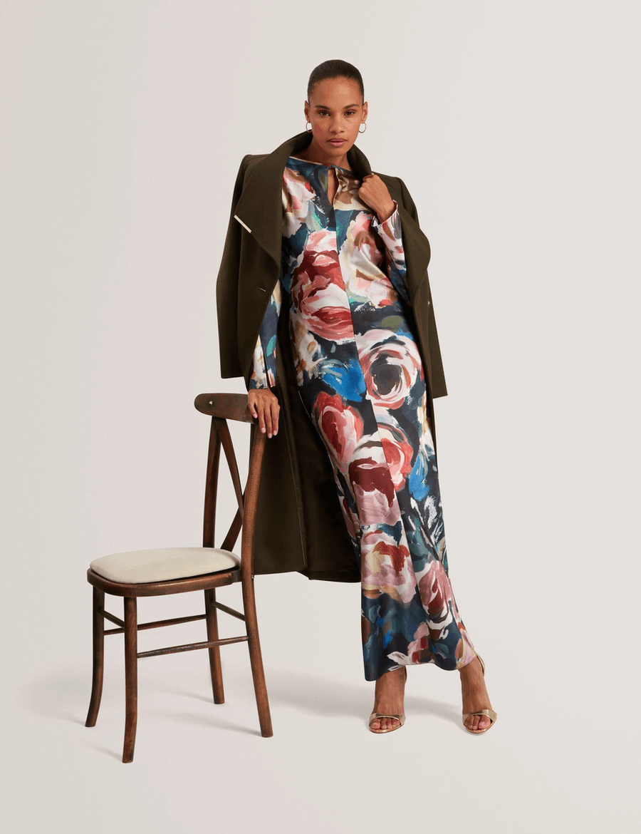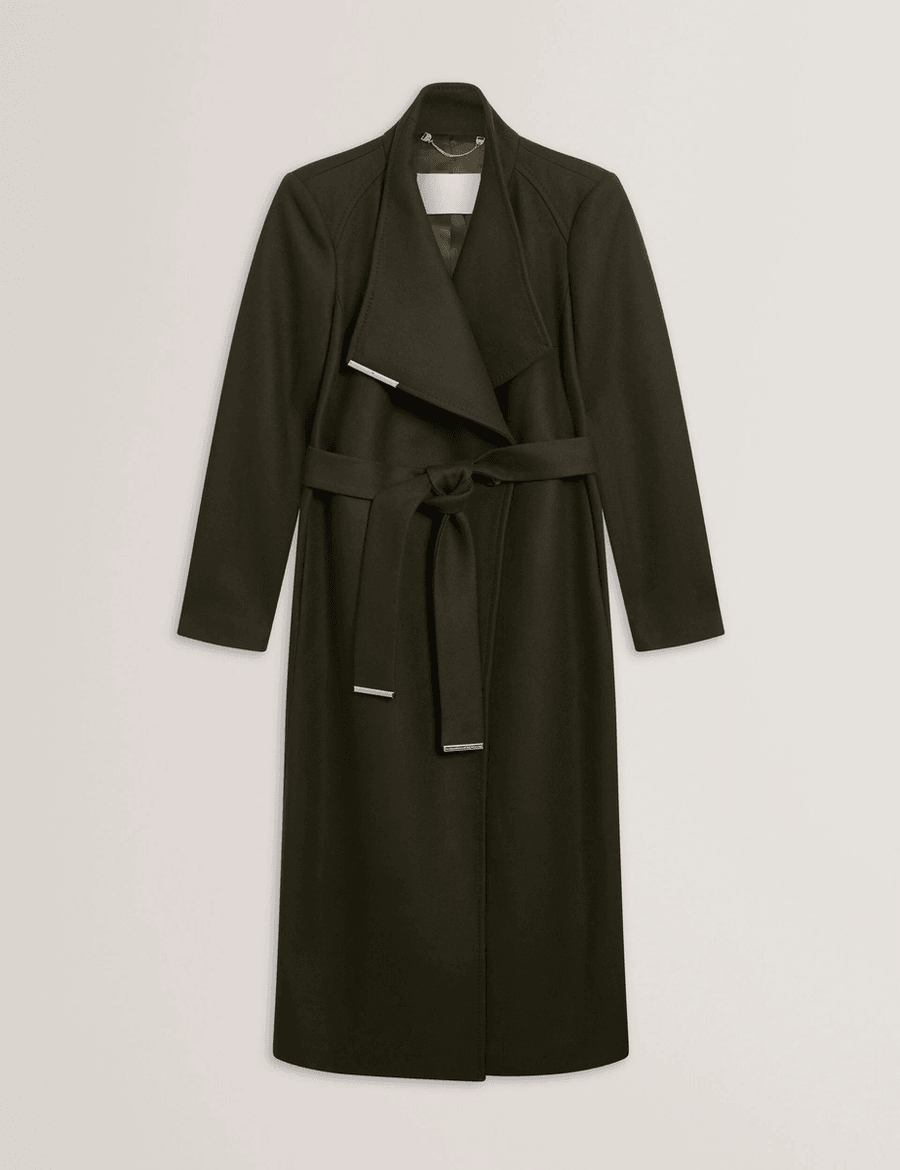 Wrap yourself in elegance with the Ted Baker ROSELL | DK-GREEN. This stunning longline coat is crafted from a luxurious blend of wool and cashmere, designed to keep you warm while making a fashion statement. With its sleek silhouette and sophisticated details, the ROSELL coat is a must-have for any wardrobe.
