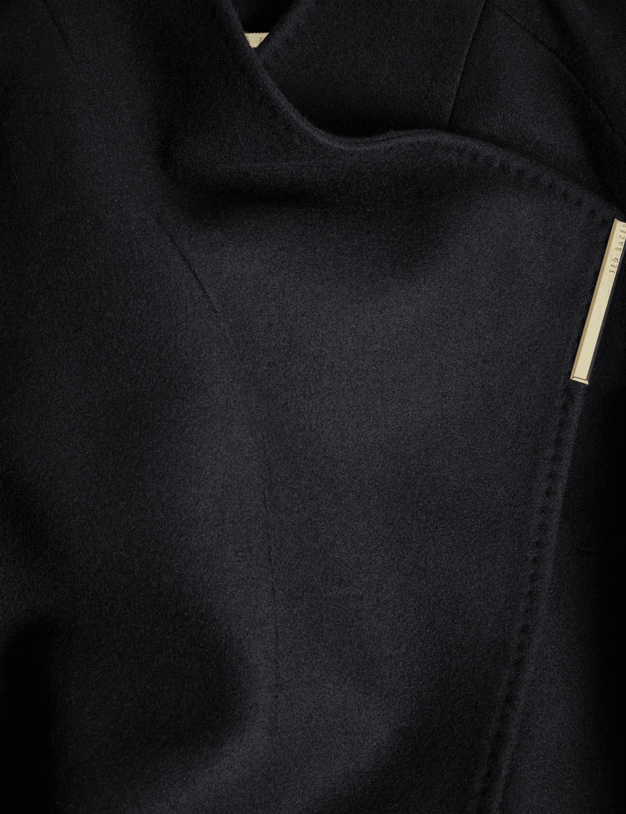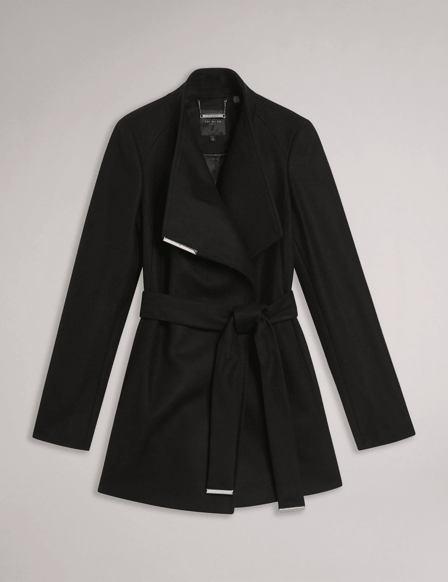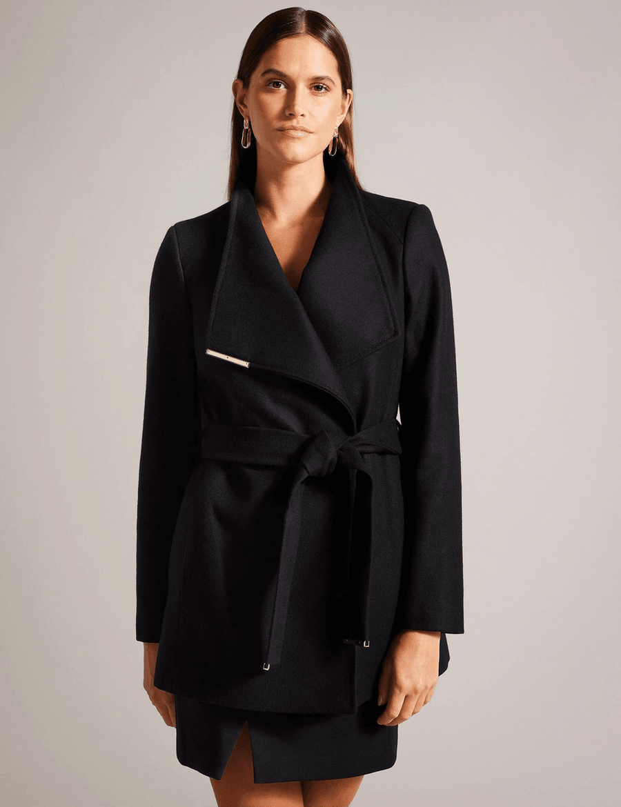 Discover the elegance of the Ted Baker ROSESS | BLACK, a stunning short coat that combines sophistication with comfort. Crafted from a luxurious wool and cashmere blend, this wrap front design ensures you stay warm while looking chic.