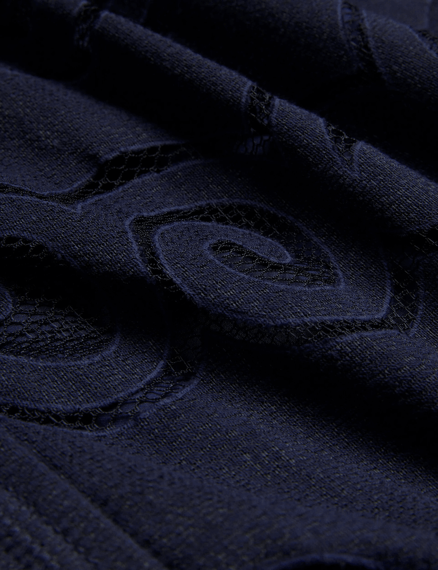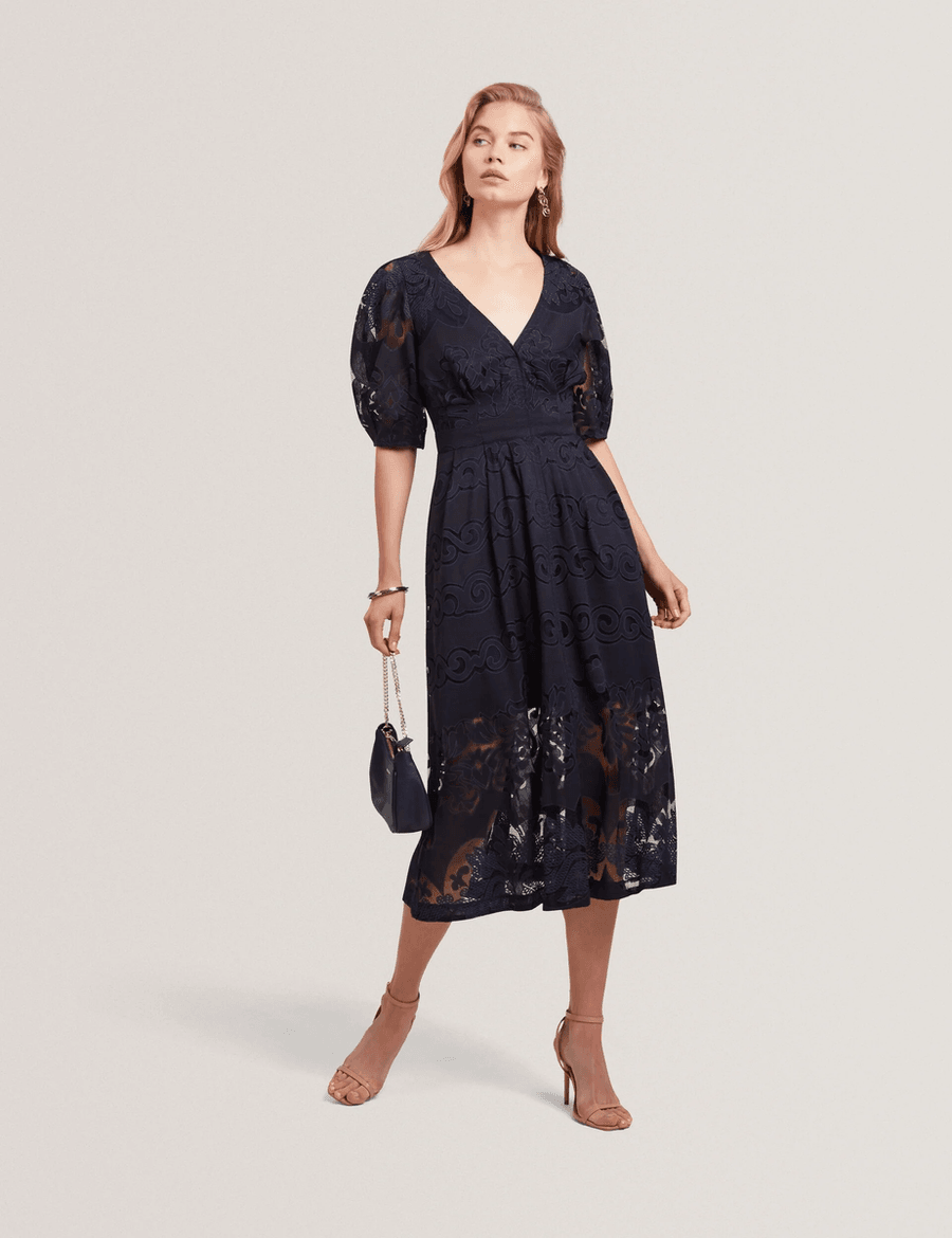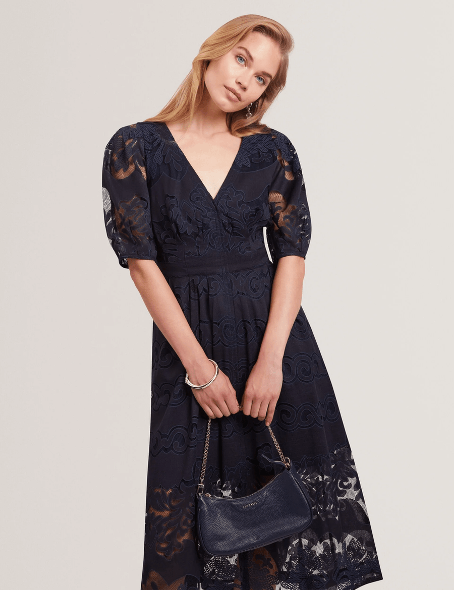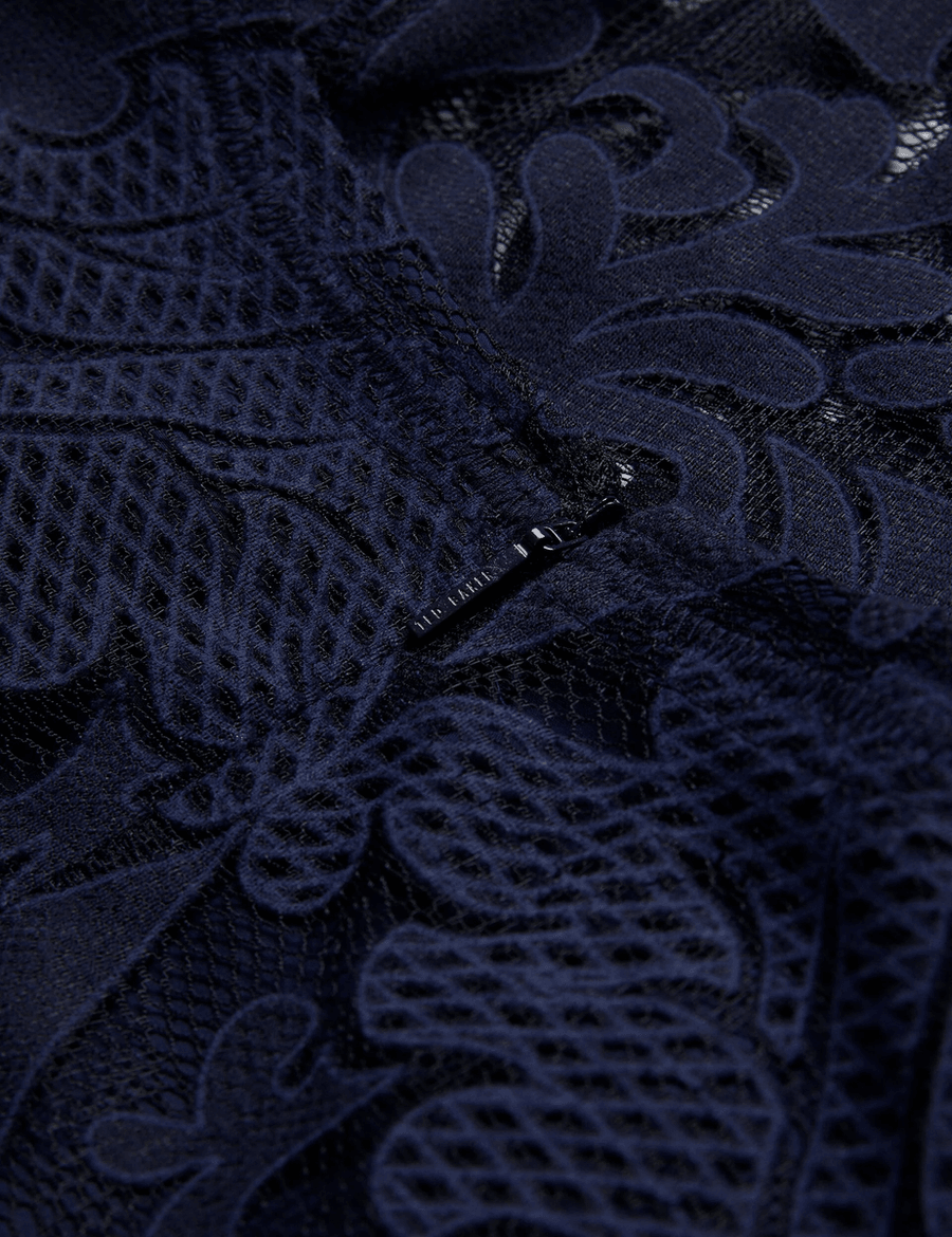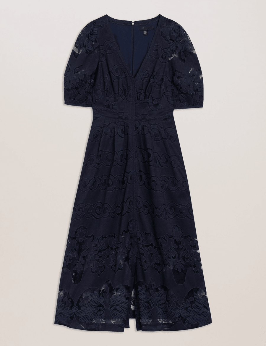 Elevate your wardrobe with the stunning Ted Baker AGNEL | NAVY midi dress, designed to make a statement at garden parties and summer weddings. This elegant piece features exquisite all-over lace embroidery that adds a unique texture, making it a must-have for special occasions.