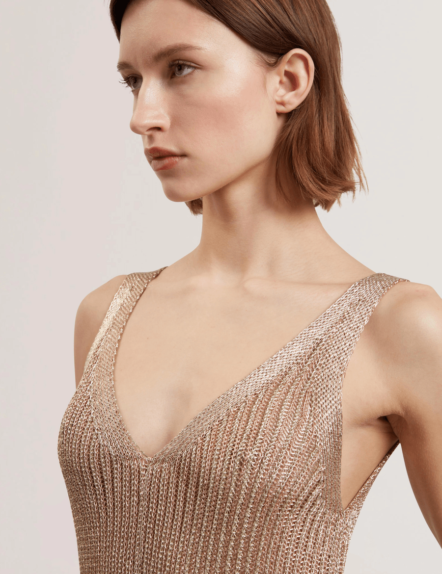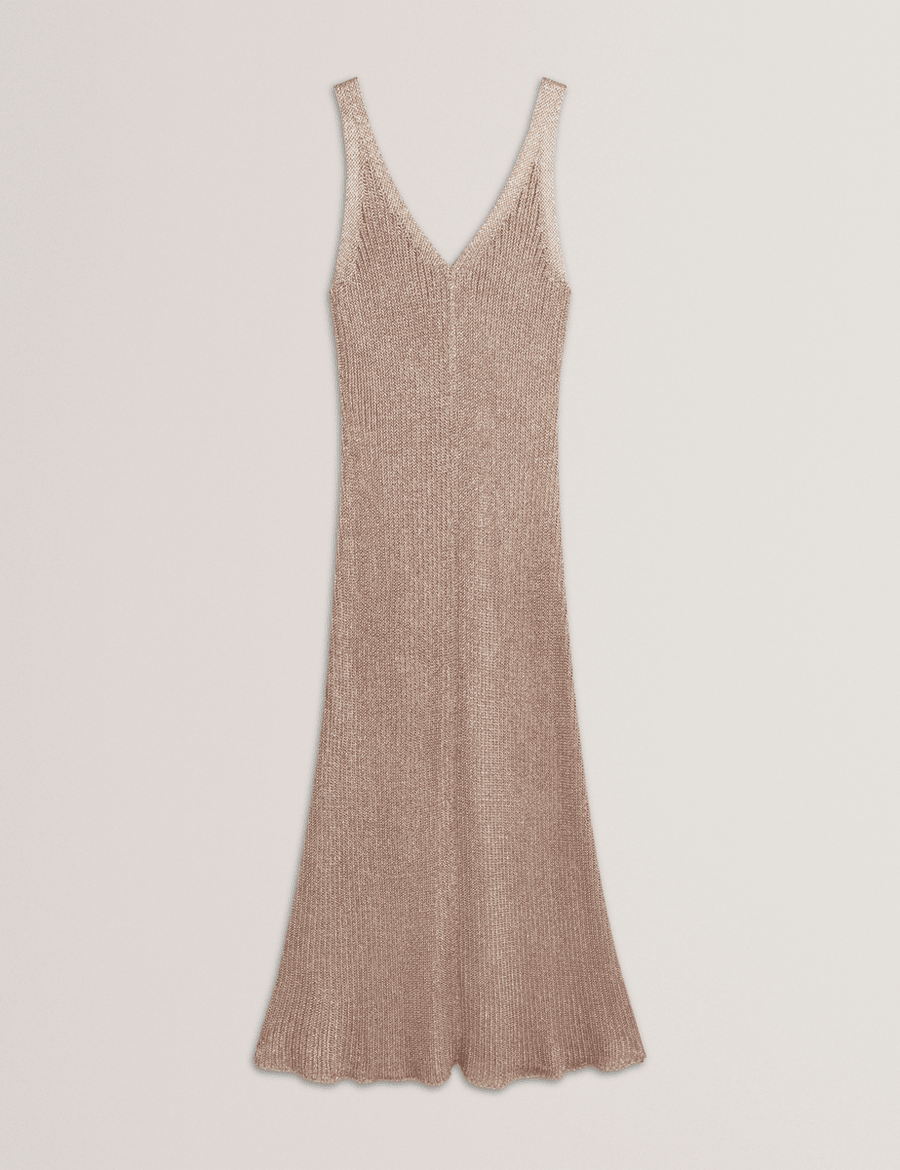 Discover the stunning Ted Baker ALARNAA | GOLD, a show-stopping maxi dress designed to make you shine. With its metallic fibre knit and elegant column silhouette, this dress is perfect for any special occasion or night out.