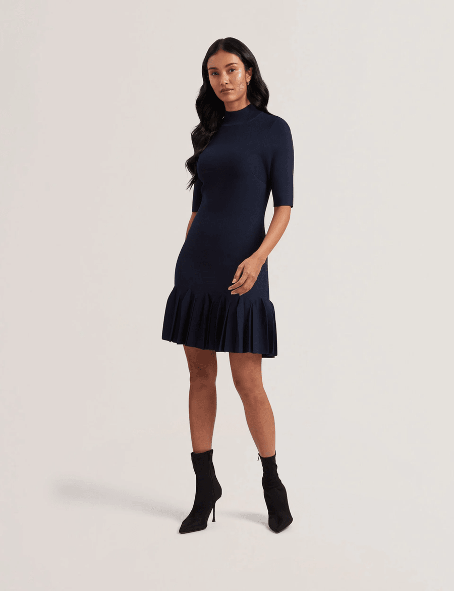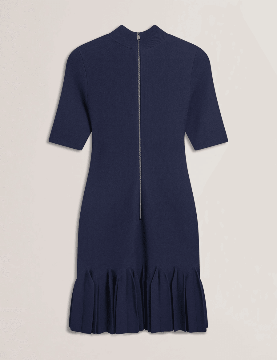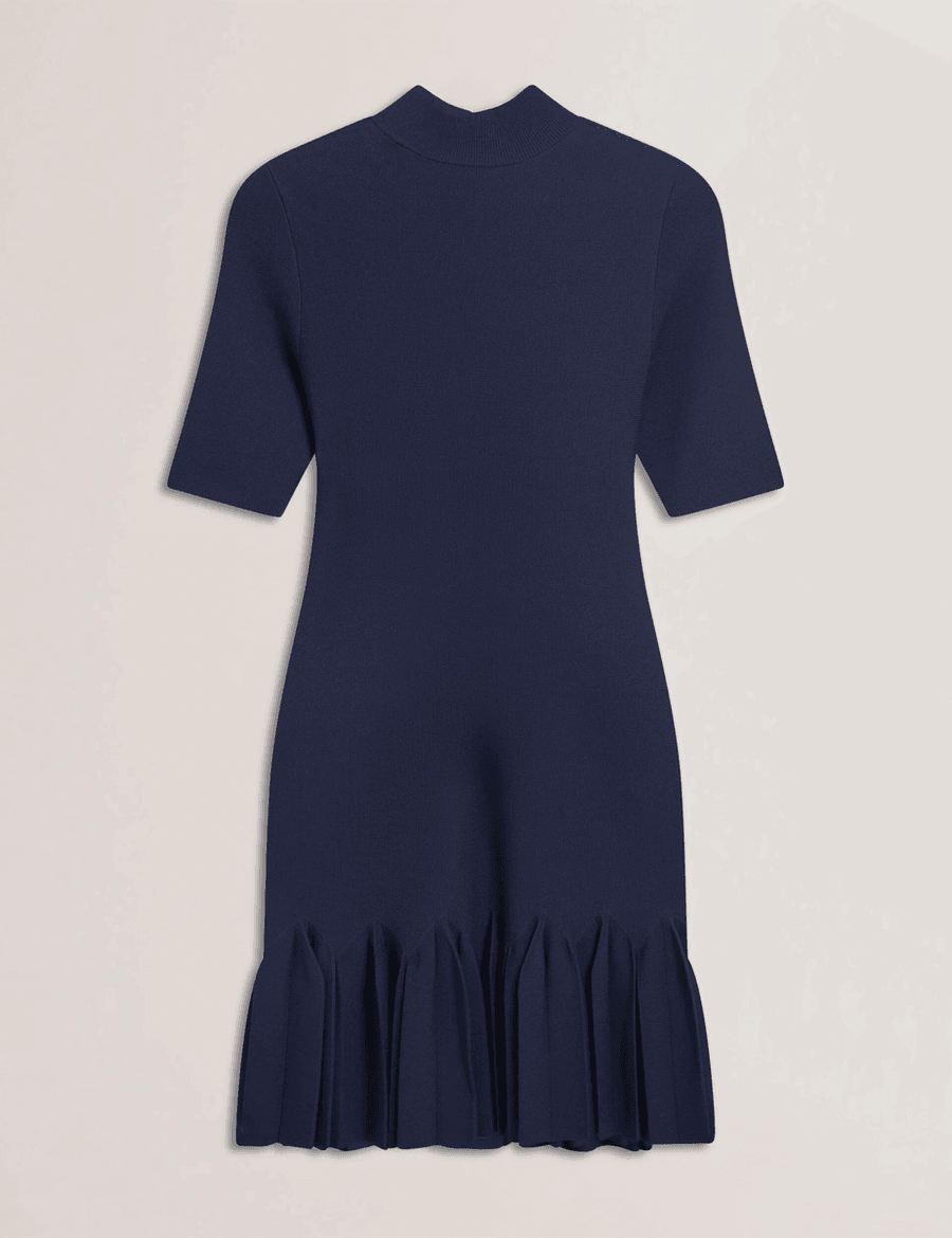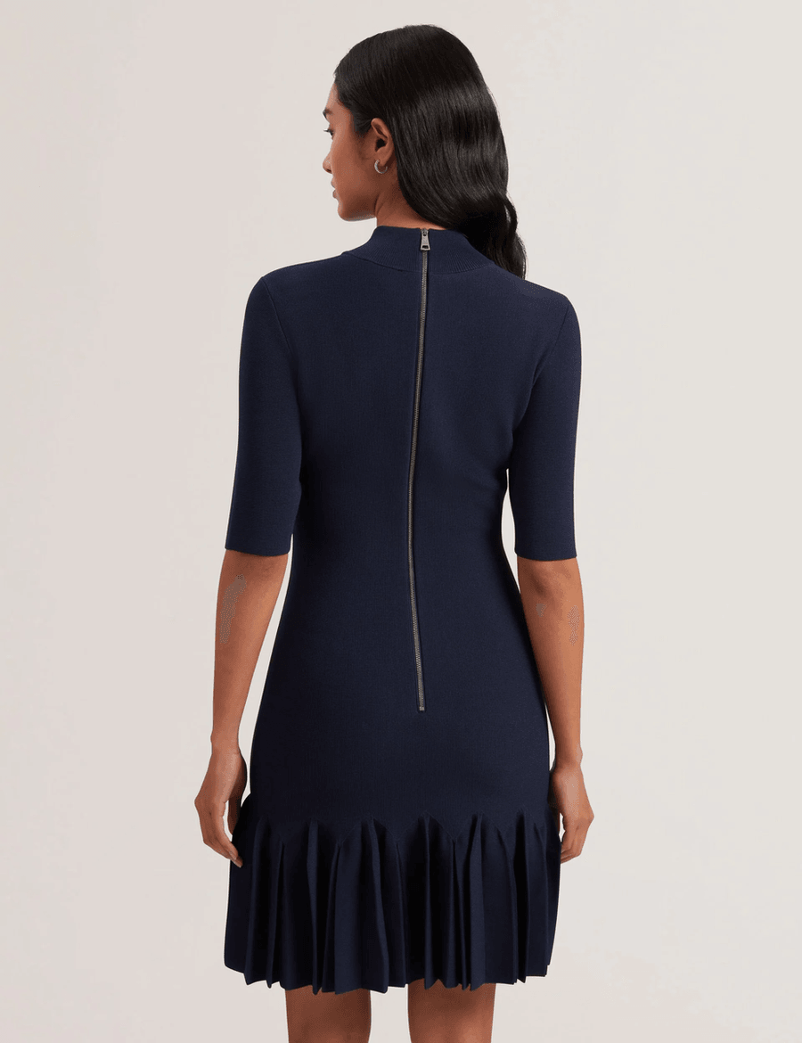 The Ted Baker CANDDY | DK-BLUE is all about striking the perfect balance between elegance and excitement. Its high neckline and half sleeves provide a sophisticated upper half, while the playful pleated hem gives it a whimsical touch. Crafted from a high-quality stretchy knit, this dress hugs your curves beautifully, ensuring you feel confident and comfortable. Ideal for special occasions, this dress effortlessly transitions from day to night.