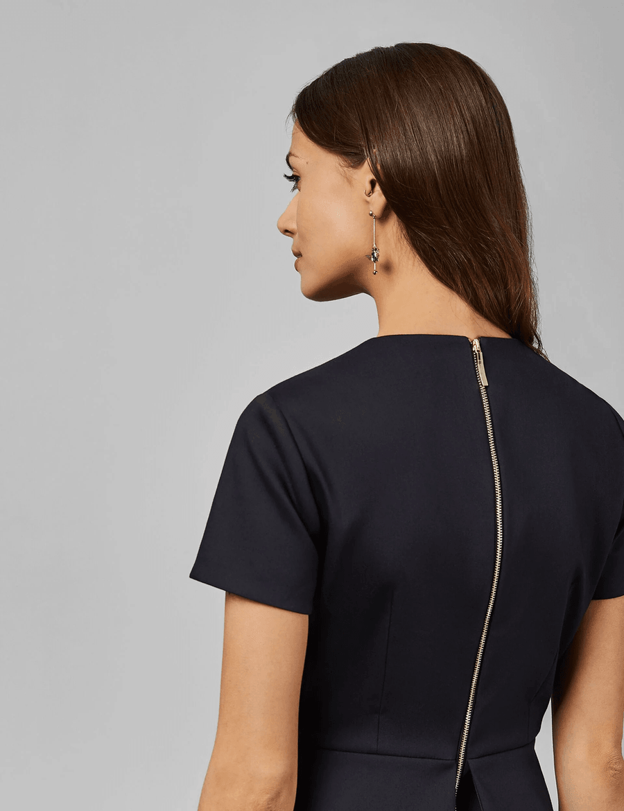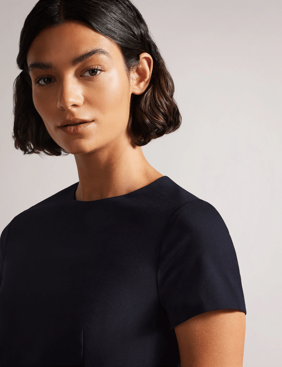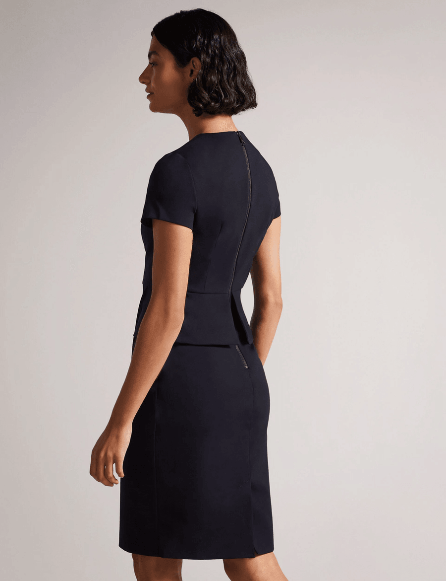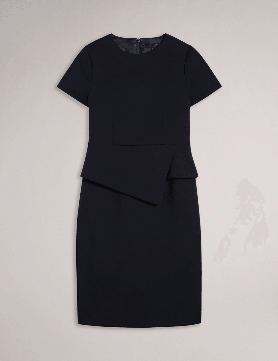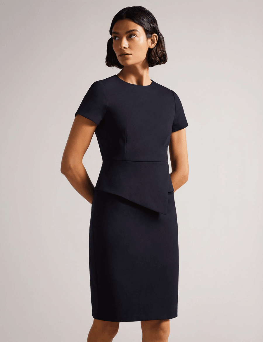 The Ted Baker ELYNAH dress is a must-have for every modern woman's wardrobe. Featuring a round neck and short sleeves, this midi-length dress is perfect for transitioning from day to night. The elegant asymmetric peplum detail not only adds a touch of sophistication but also allows for ease of movement throughout your busy day. Our model stands at 5'9" (1.75m) and wears a Ted size 1, showcasing how this dress flatters all body types.