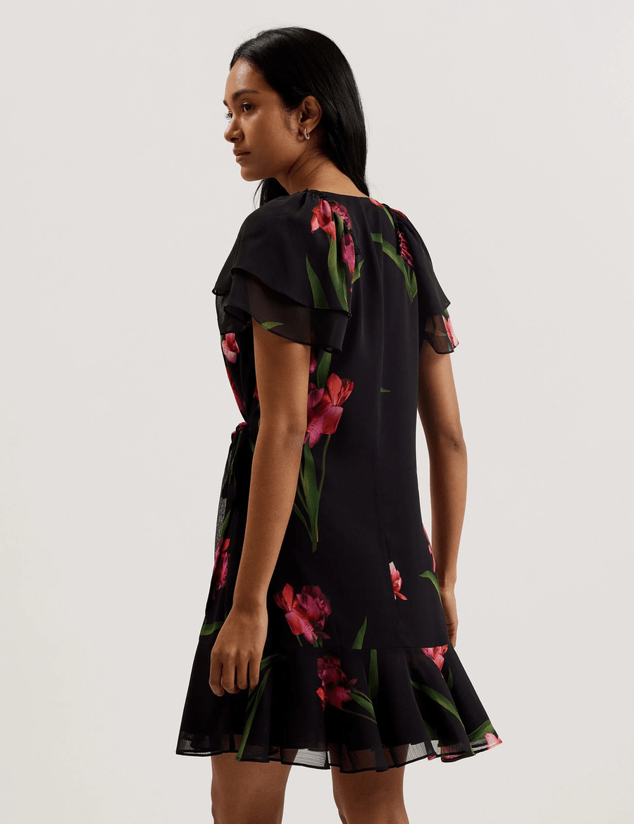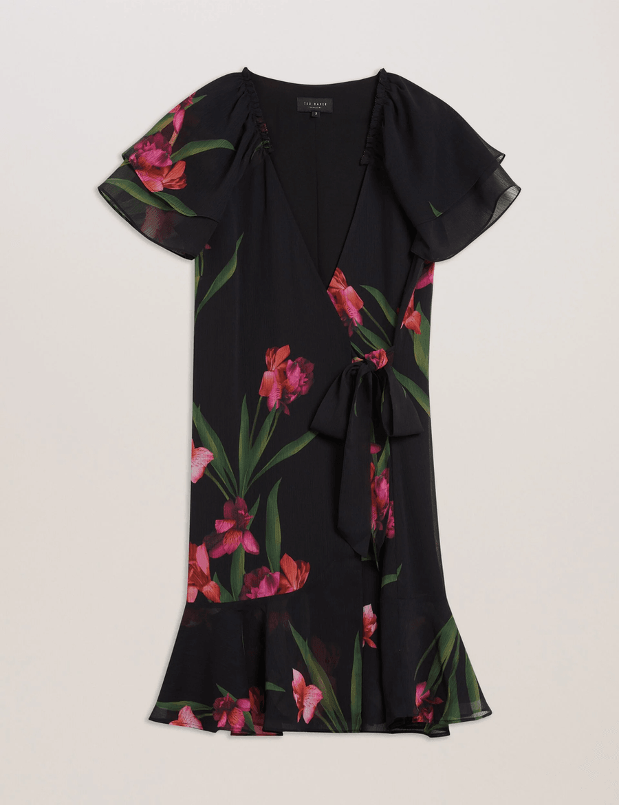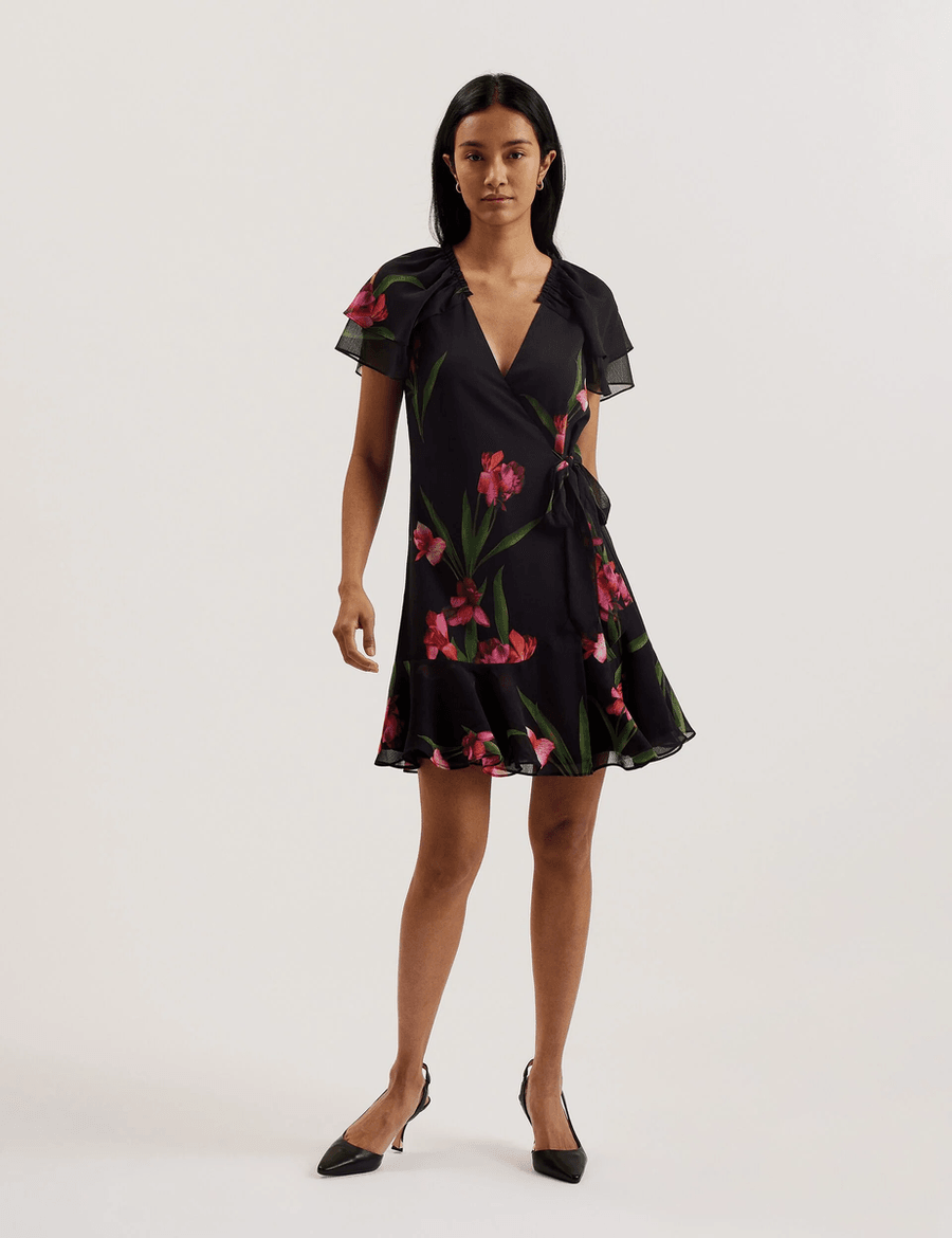 Discover the stunning Ted Baker FASNIA | BLACK, a mini wrap dress that effortlessly combines elegance and comfort. This dress features a captivating photographic floral print on luxurious crinkled chiffon fabric, making it a perfect choice for any occasion.