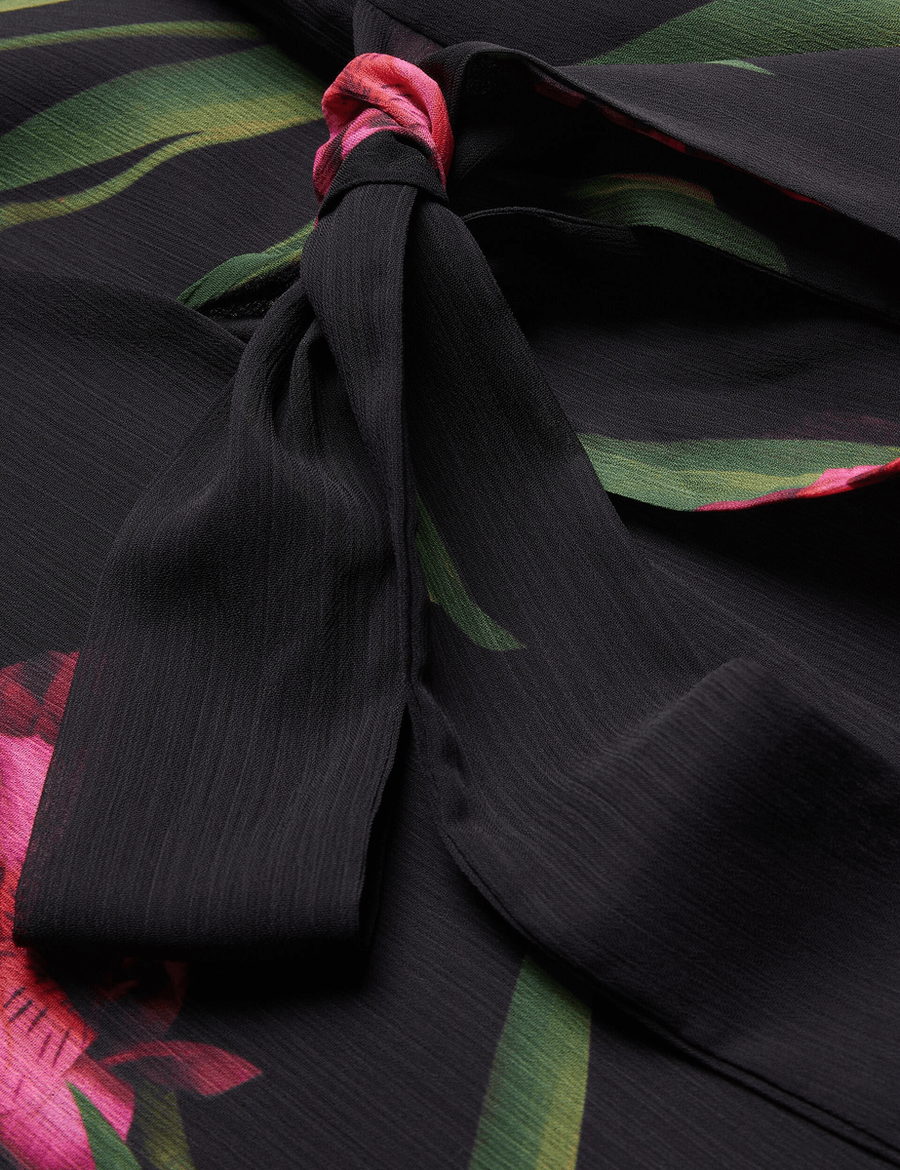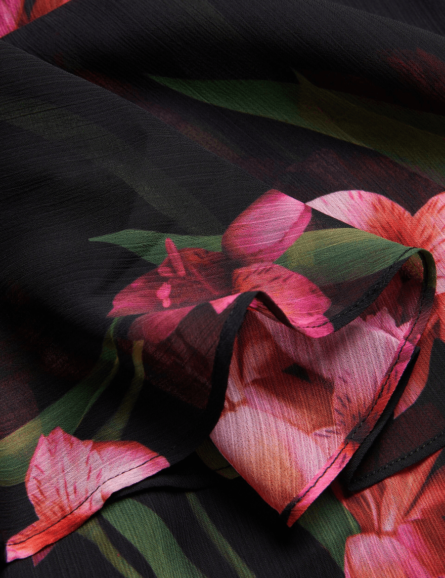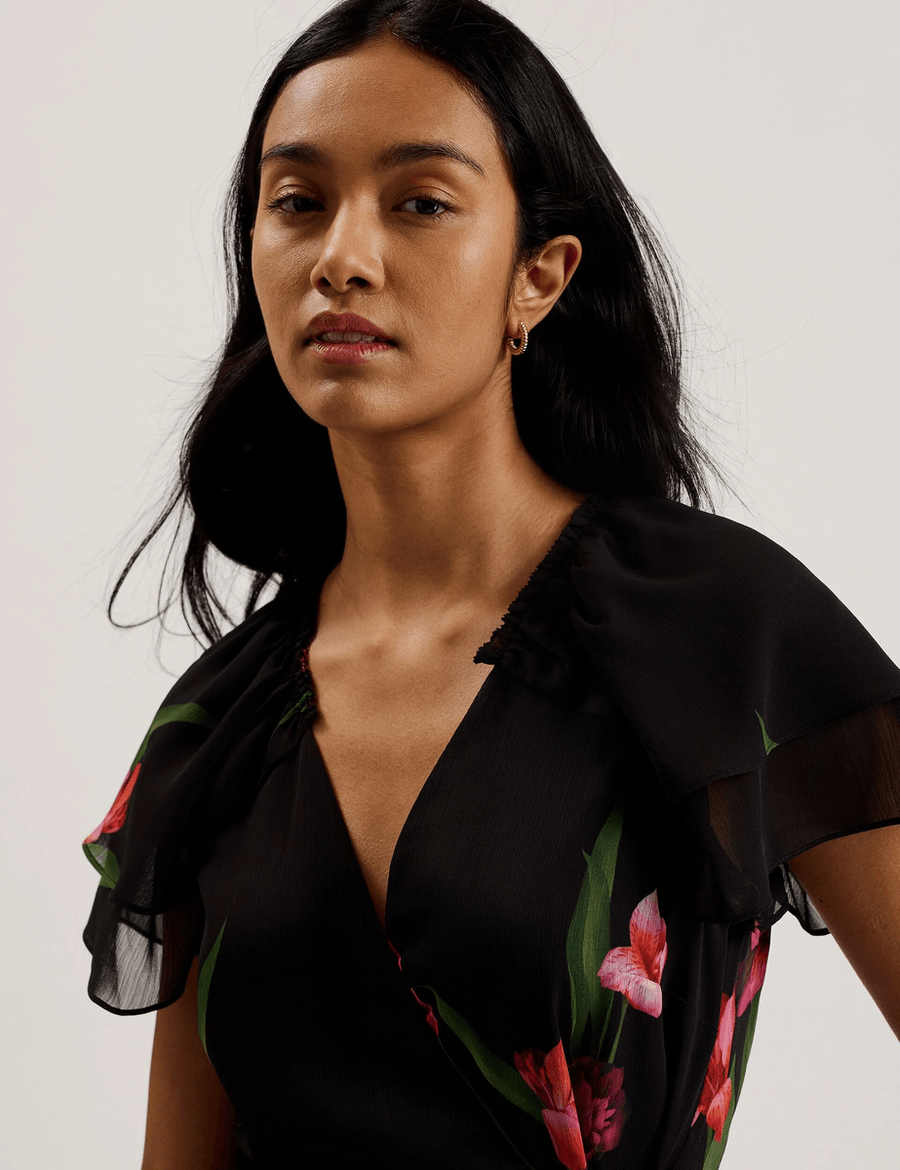 Discover the stunning Ted Baker FASNIA | BLACK, a mini wrap dress that effortlessly combines elegance and comfort. This dress features a captivating photographic floral print on luxurious crinkled chiffon fabric, making it a perfect choice for any occasion.