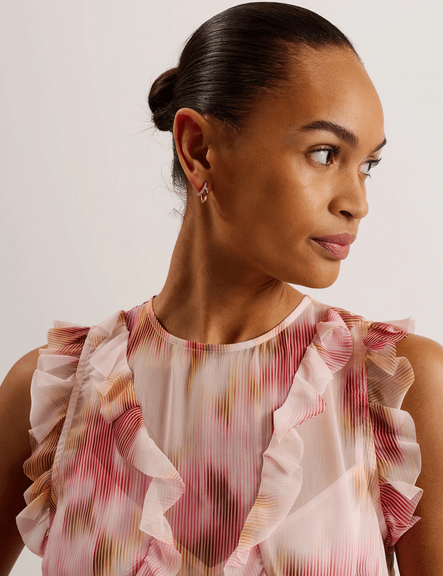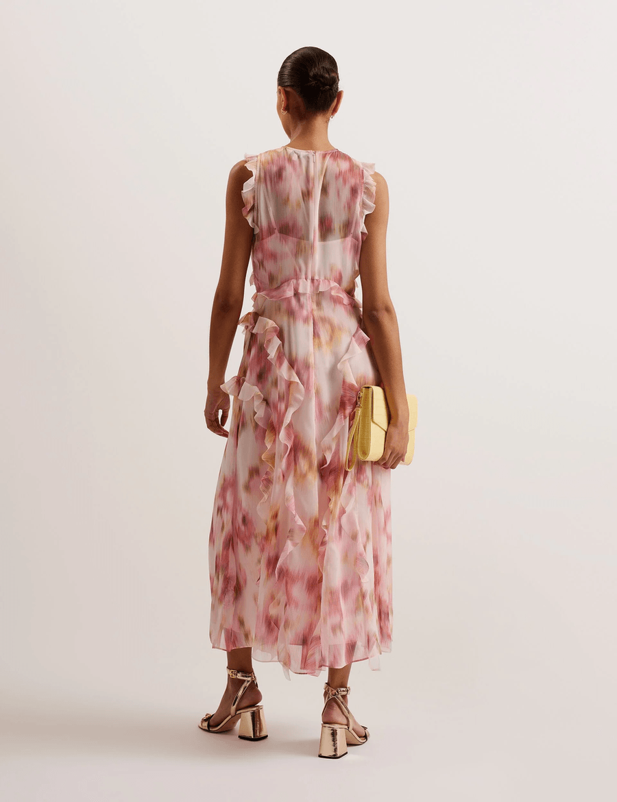 The Ted Baker HISAKO | LT-PINK midi dress showcases an exquisite design with vertical waterfall ruffles cascading down the skirt, enhancing its flowy aesthetic. The all-over blurred floral print adds a touch of whimsy, making it an ideal choice for daytime events or romantic evenings. Stephanie, standing at 5'8.5" (1.74m), effortlessly showcases this dress in size light pink, highlighting its flattering fit.