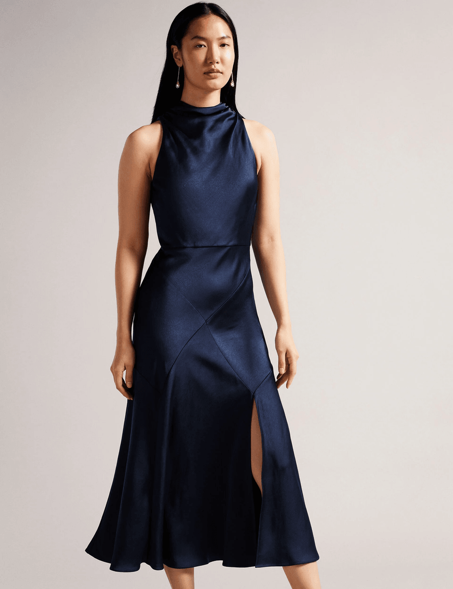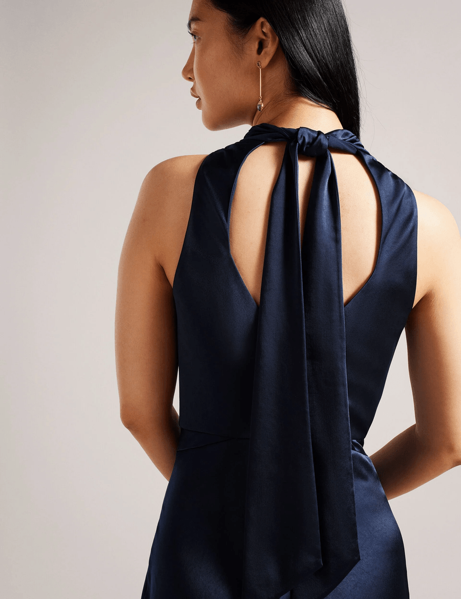 Step into the spotlight with the Ted Baker LILYMAY dress in stunning dark blue. This elegant midi dress is designed to turn heads, whether you’re at a cocktail bar or dancing the night away. With its flirty self-tied back and chic cut-out detail, the LILYMAY combines sophistication with a playful edge.