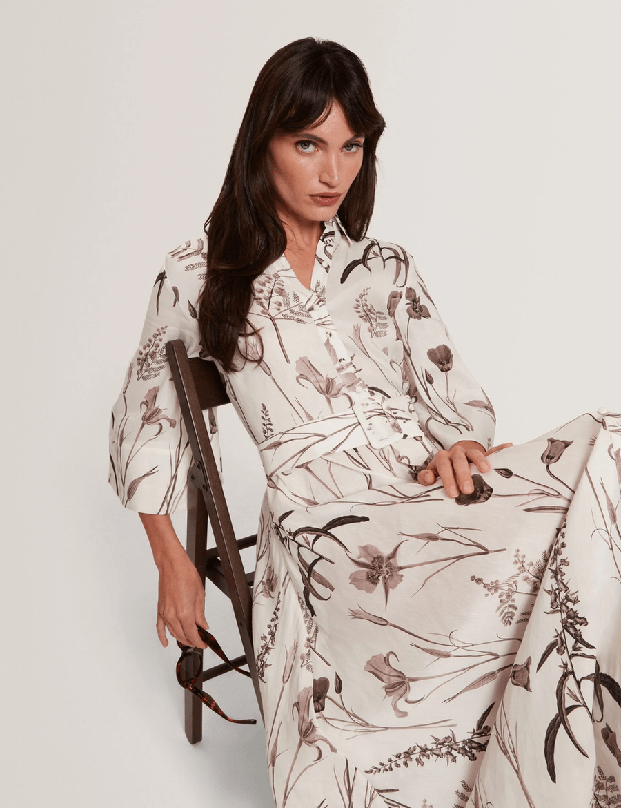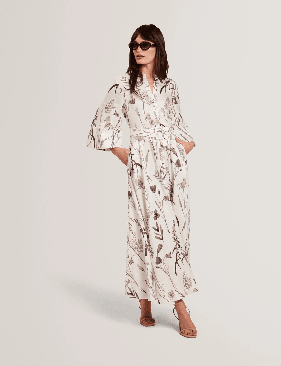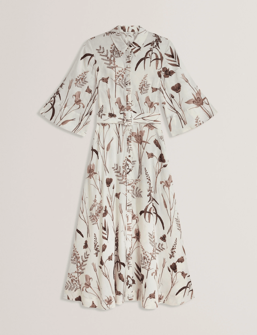 Discover the elegance of the Ted Baker LUWISA | IVORY midi shirt dress. Crafted from a luxurious linen-silk blend, this stunning dress features a muted floral print that embodies sophistication and style. Perfect for any occasion, the three-quarter wide sleeves and a matching waist belt create a flattering silhouette that enhances your figure.