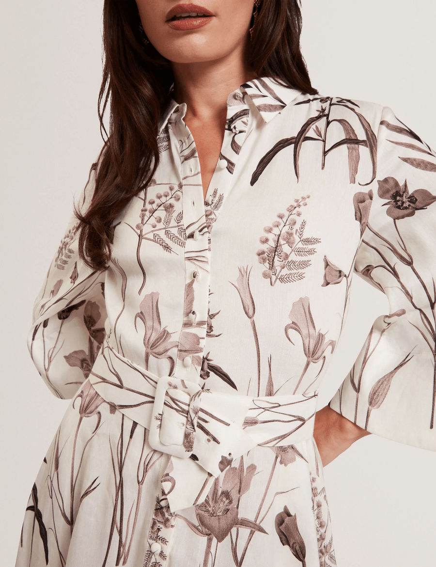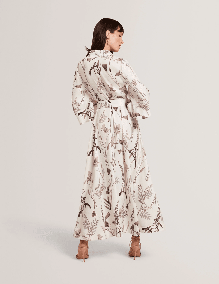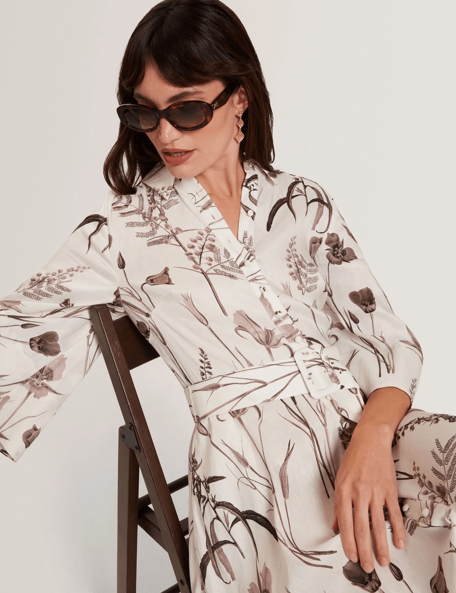 Discover the elegance of the Ted Baker LUWISA | IVORY midi shirt dress. Crafted from a luxurious linen-silk blend, this stunning dress features a muted floral print that embodies sophistication and style. Perfect for any occasion, the three-quarter wide sleeves and a matching waist belt create a flattering silhouette that enhances your figure.