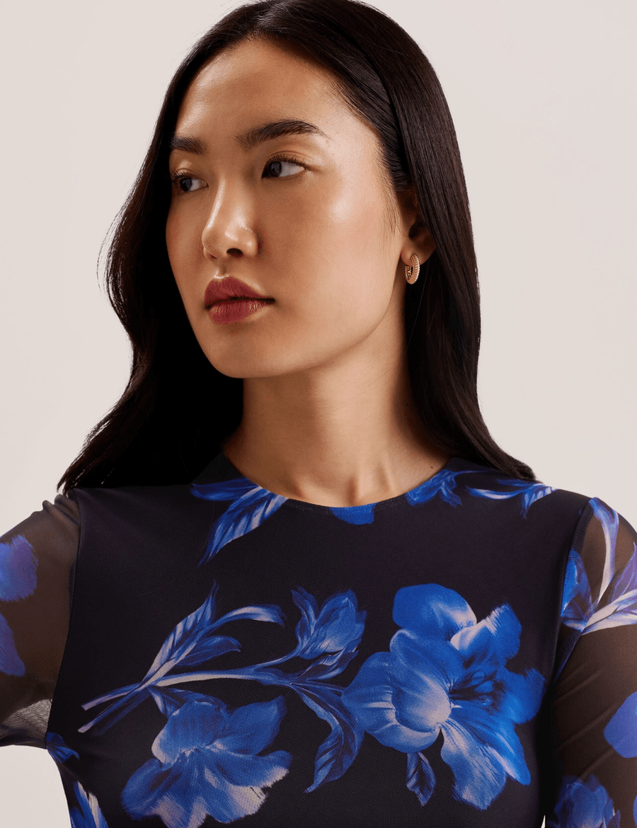Discover the stunning Ted Baker MARLIYY | BLUE, a captivating midi dress that effortlessly combines elegance and modern flair. This dress features a beautiful floral print and a delicate mesh fabric, perfect for special occasions or a chic night out.