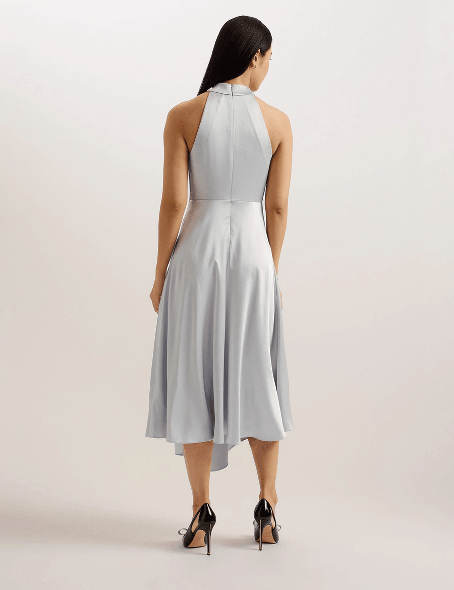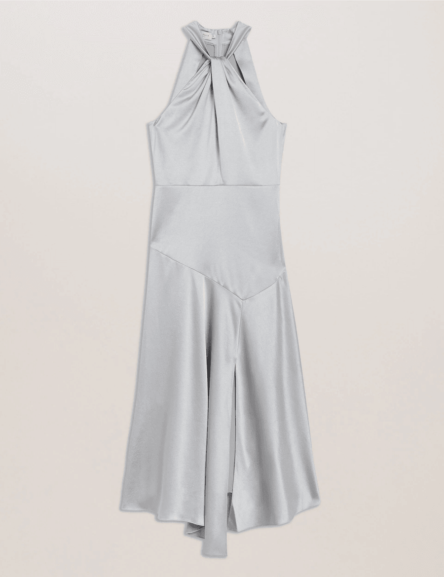 Elevate your wardrobe with the stunning Ted Baker MASAE midi dress in LT-GREY. This dress is designed to mesmerize with its elegant twist halterneck and sophisticated silhouette, making it the perfect choice for any special occasion.