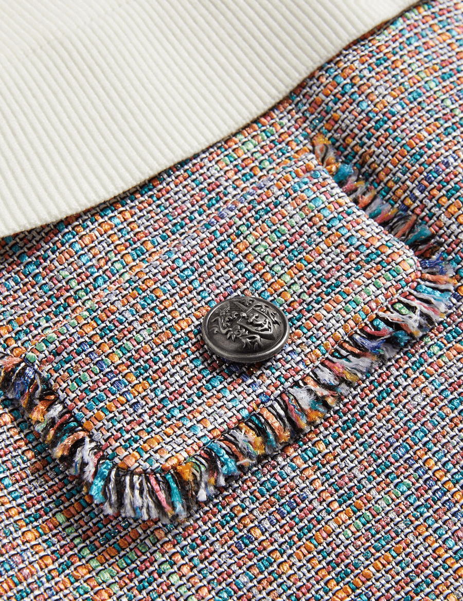 - Functional Details: Includes flap pockets adorned with metal buttons and a trendy frayed trim.