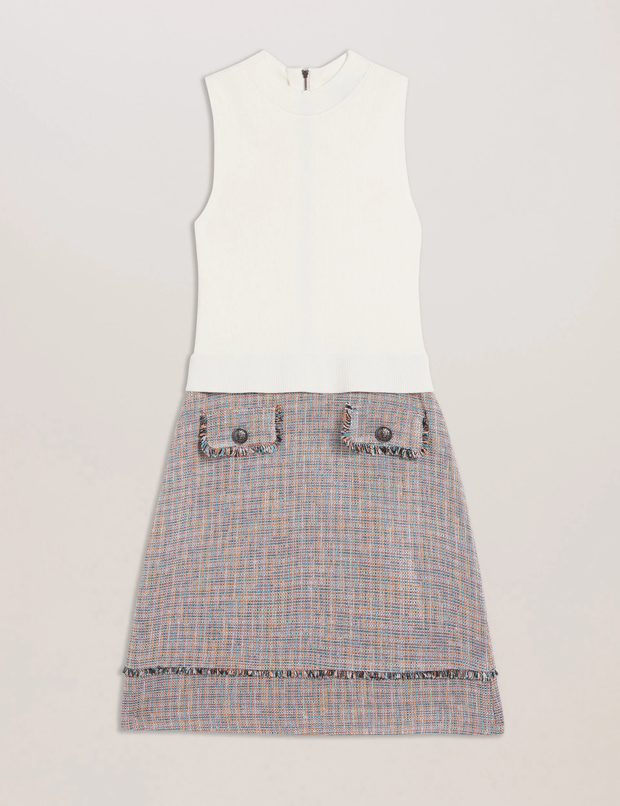 The Ted Baker MAYUMID | IVORY is designed to make a statement. Its knitted sleeveless bodice ensures comfort, while the boucle skirt adds a touch of luxury. Whether you’re heading to the office or a brunch with friends, this mini dress provides a stylish solution that flatters all body types.