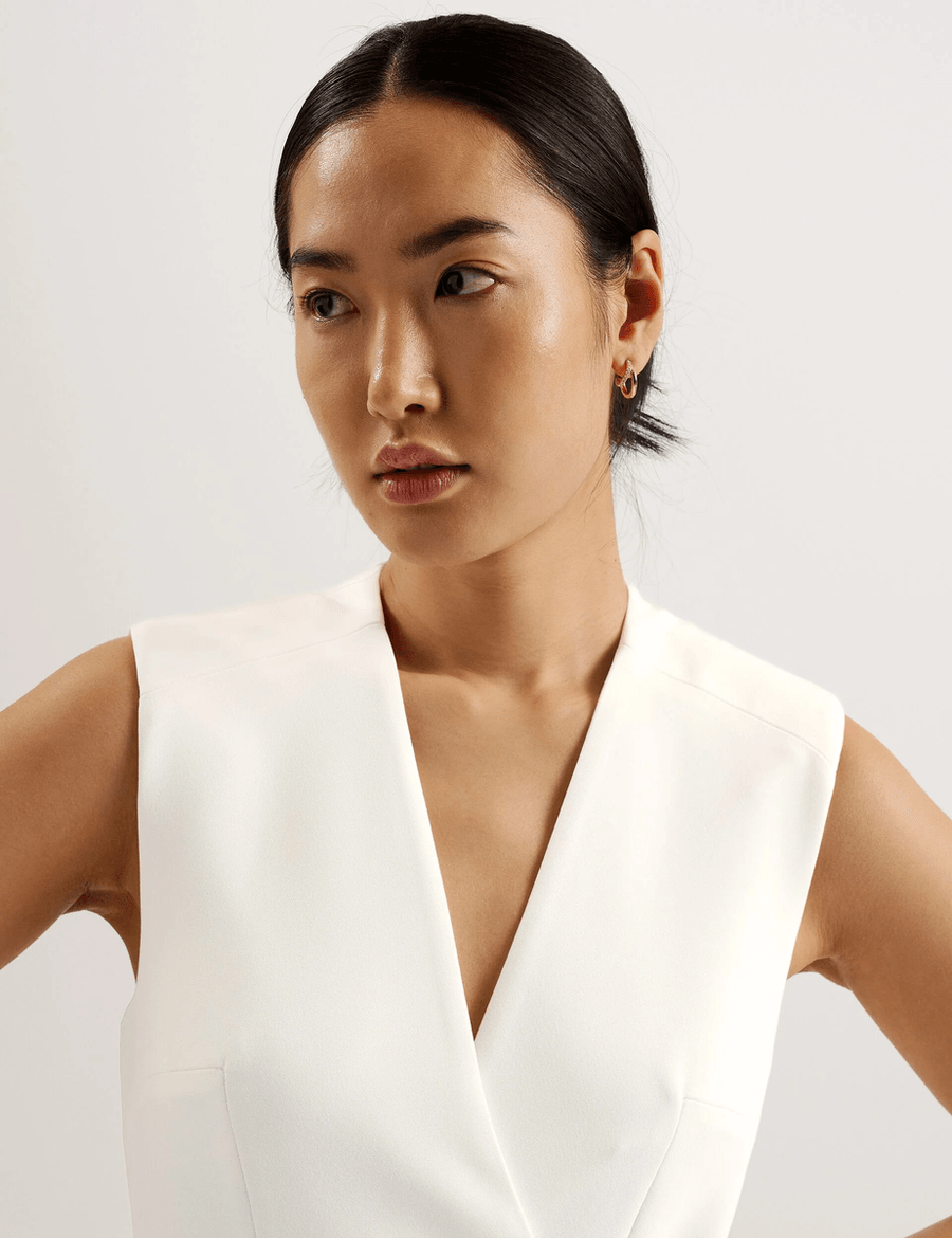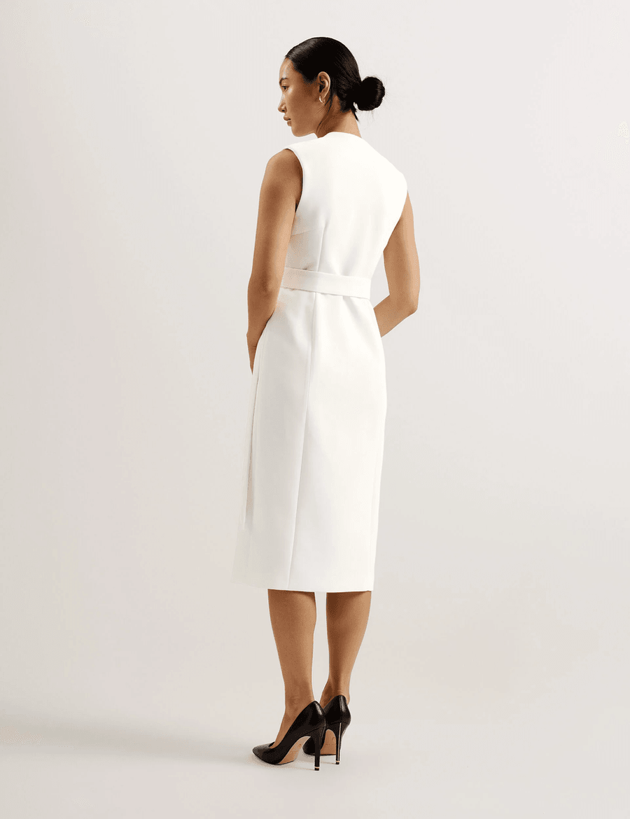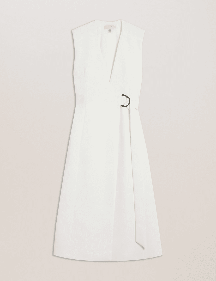 Discover the elegance of the Ted Baker MOLENAA | IVORY, a stunning blend of contemporary style and classic tailoring. This sleeveless wrap midi dress offers a fresh take on timeless fashion, perfect for the modern woman who values both sophistication and versatility.