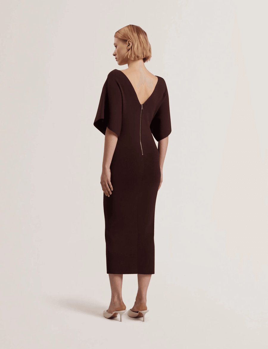 Discover the ultimate blend of style and comfort with the Ted Baker REBEXXA | DK-BROWN bodycon midi dress. Designed to sculpt and flatter, this dress is perfect for any occasion, whether it’s a day at the office or a night out on the town.