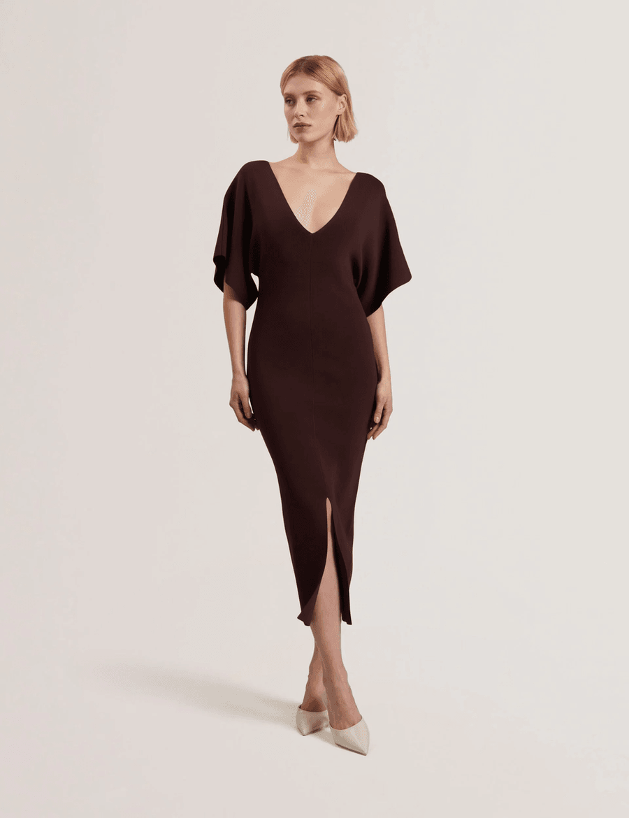 The Ted Baker REBEXXA | DK-BROWN dress features a stunning bodycon fit that highlights your curves while providing a sophisticated look. The lightweight knitted fabric ensures you stay comfortable throughout the day, while the low v-neckline and wide short sleeves create an effortlessly stylish appearance. With a split front hem and centre seam detail, this dress offers a contemporary edge that sets it apart from the rest.