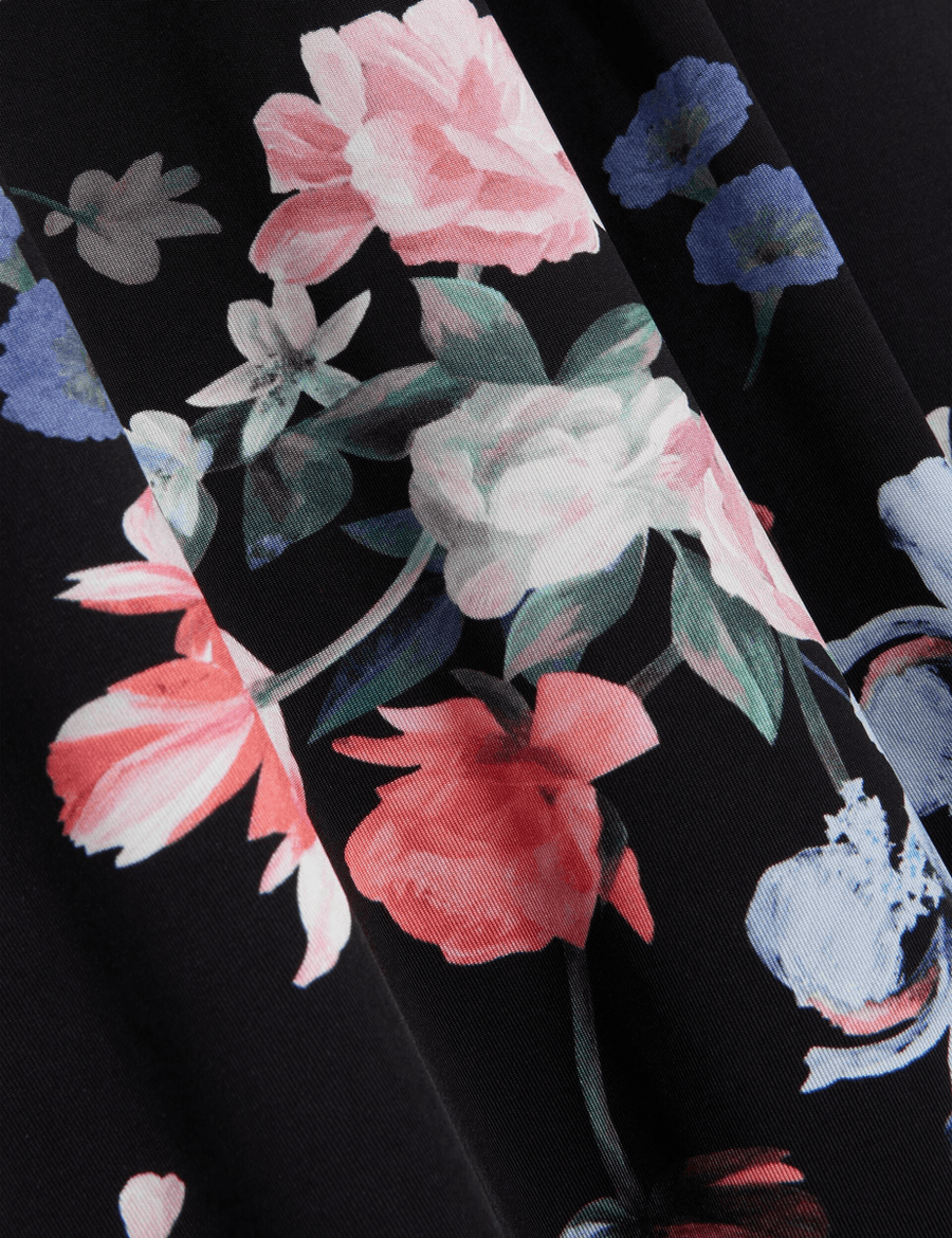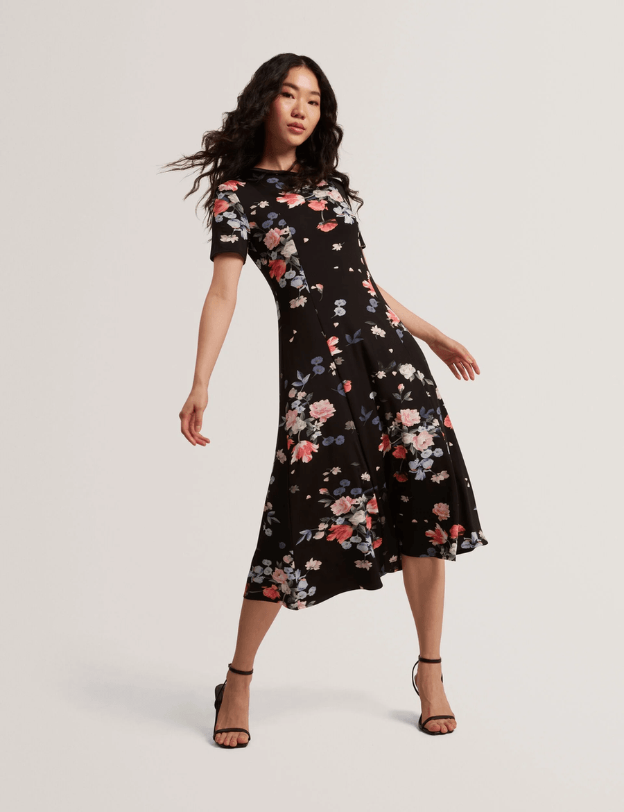 Elevate your wardrobe with the stunning Ted Baker SHORT SLEEVE JERSEY MAXI DRESS | RICH BLACK. This exquisite dress seamlessly blends vibrant floral designs with a relaxed silhouette, making it an essential piece for any fashion-forward individual.