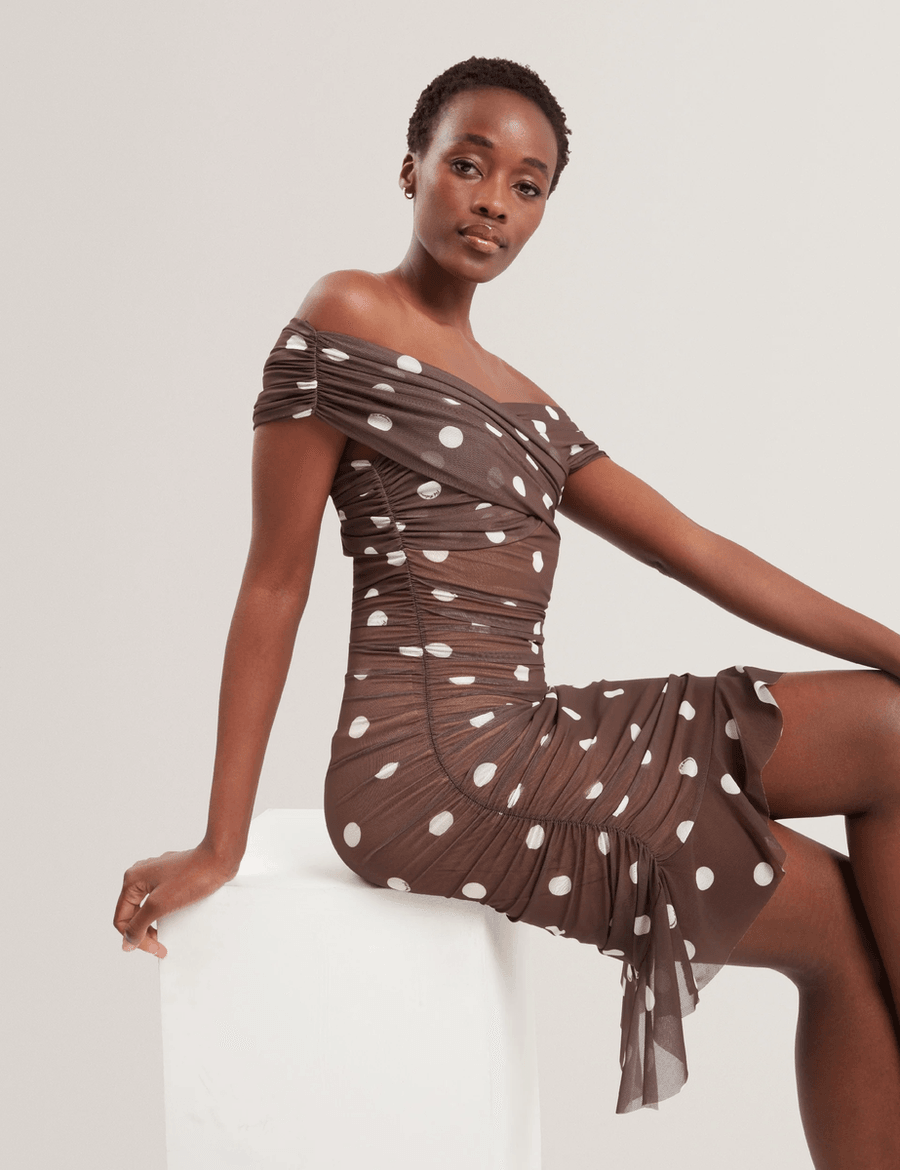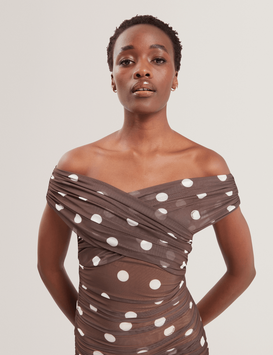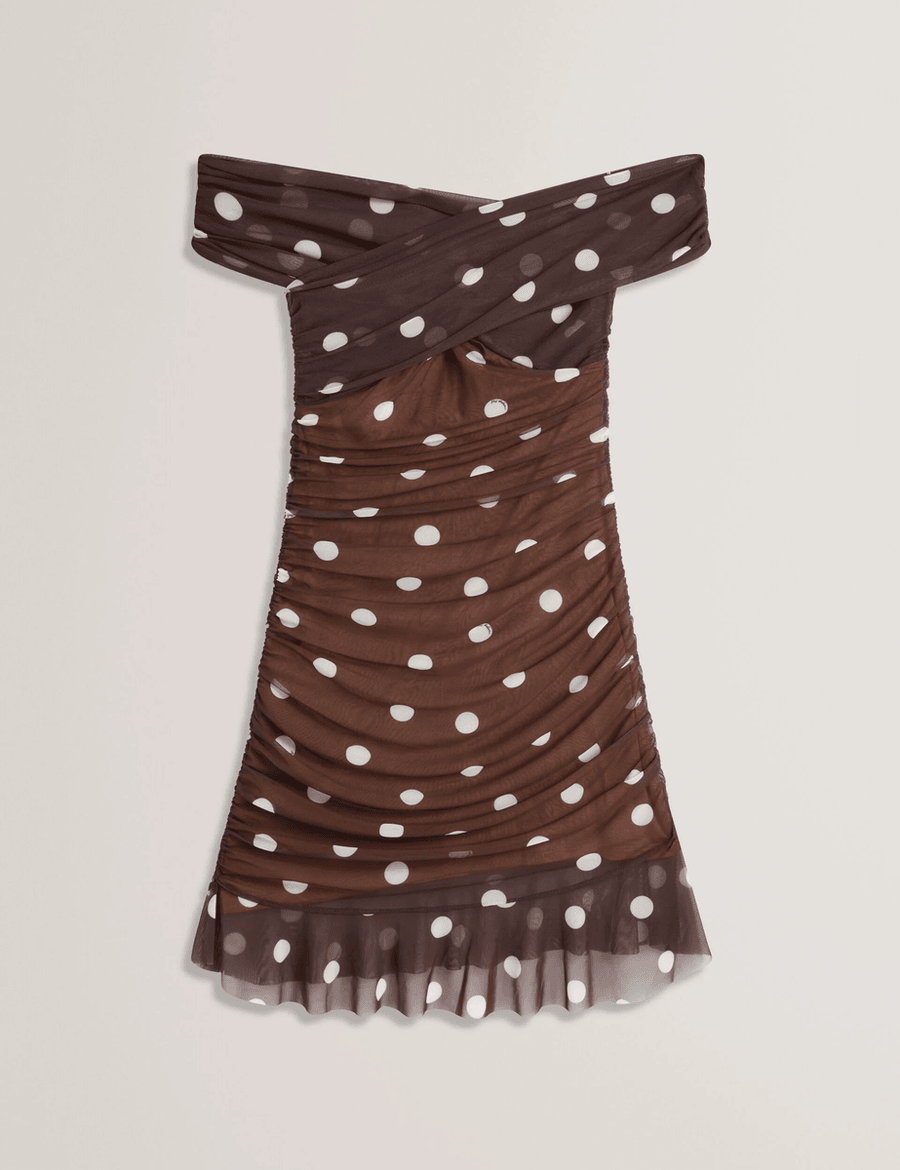 The Ted Baker TILDAHH | DK-BROWN dress is designed for the modern woman who values both style and comfort. Featuring a stunning all-over polka dot print, this dress captures attention effortlessly. The wide crossover straps and off-the-shoulder neckline create a flattering silhouette, while the ruched fabric and side gathers ensure a perfect fit that moves with you.