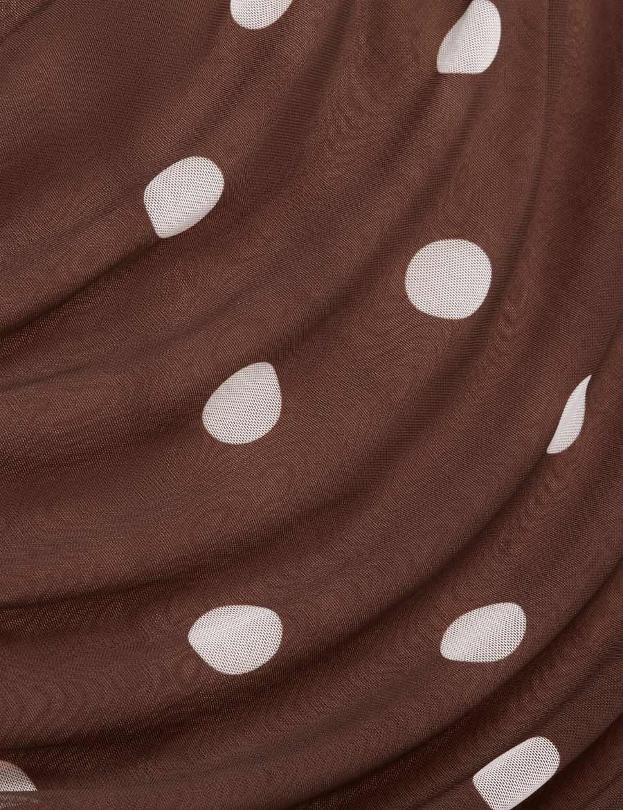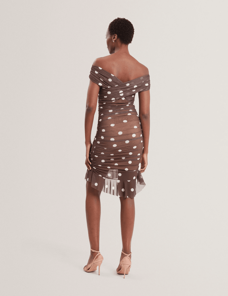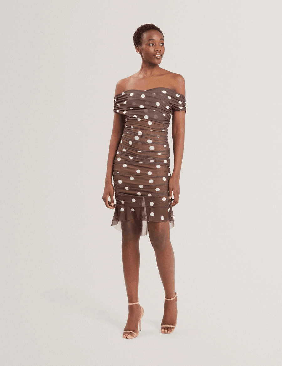 The Ted Baker TILDAHH | DK-BROWN dress is designed for the modern woman who values both style and comfort. Featuring a stunning all-over polka dot print, this dress captures attention effortlessly. The wide crossover straps and off-the-shoulder neckline create a flattering silhouette, while the ruched fabric and side gathers ensure a perfect fit that moves with you.
