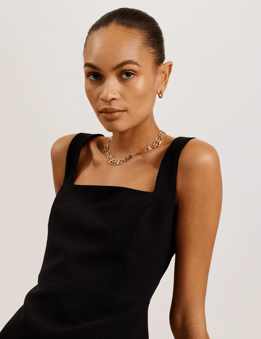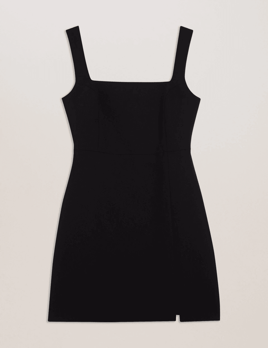The Ted Baker WYNOD mini dress is meticulously crafted to offer both style and comfort. The square neck and wide straps create a sophisticated neckline, while the playful leg slit adds a hint of allure. Transition seamlessly from daytime professionalism to evening elegance with this versatile dress.