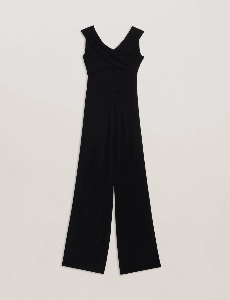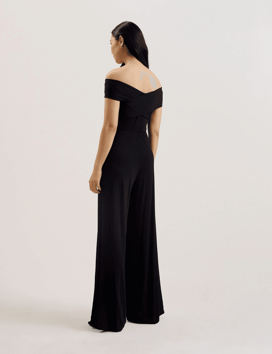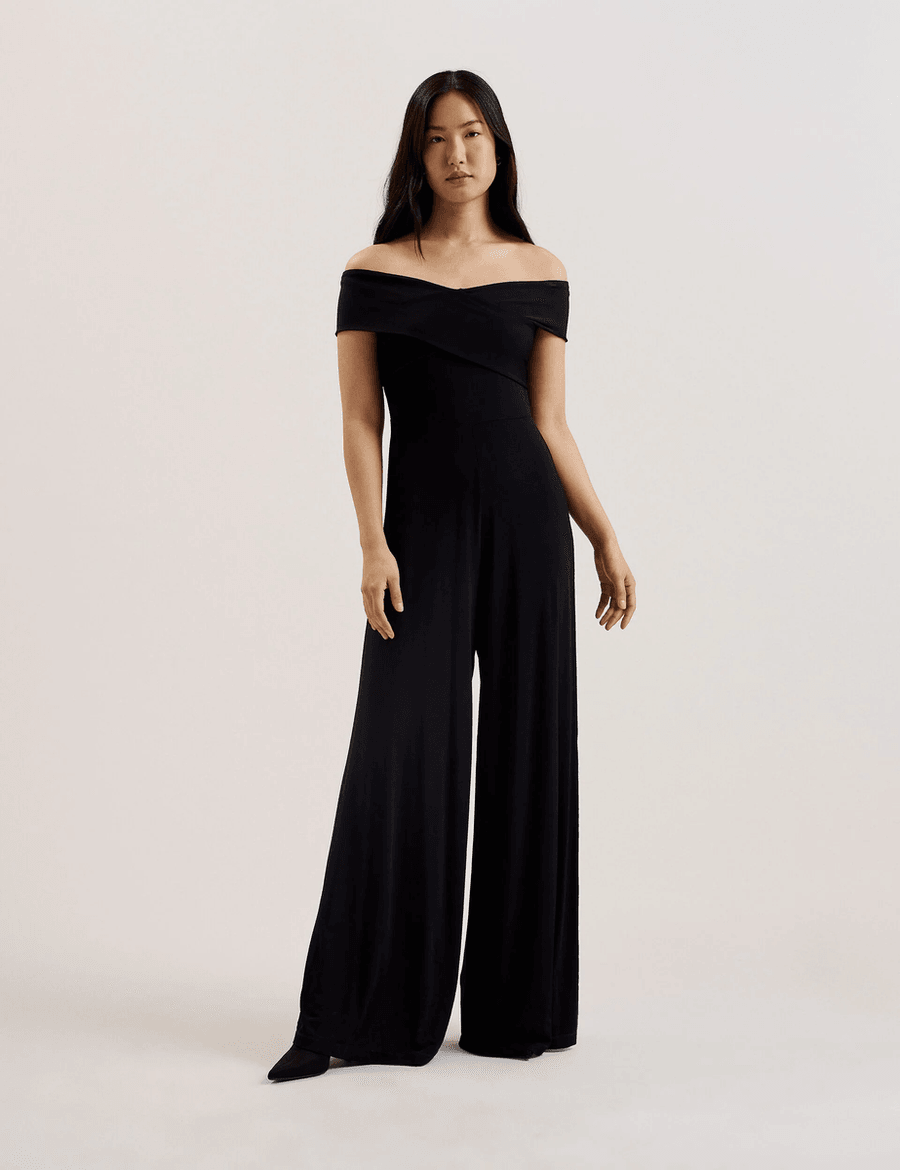 Discover the stunning Ted Baker ALMHAA | BLACK jumpsuit, designed to make a statement at any occasion. With its off-the-shoulder bardot neckline and wide-leg silhouette, this jumpsuit combines elegance with comfort in a soft jersey fabric that hugs your curves perfectly.
