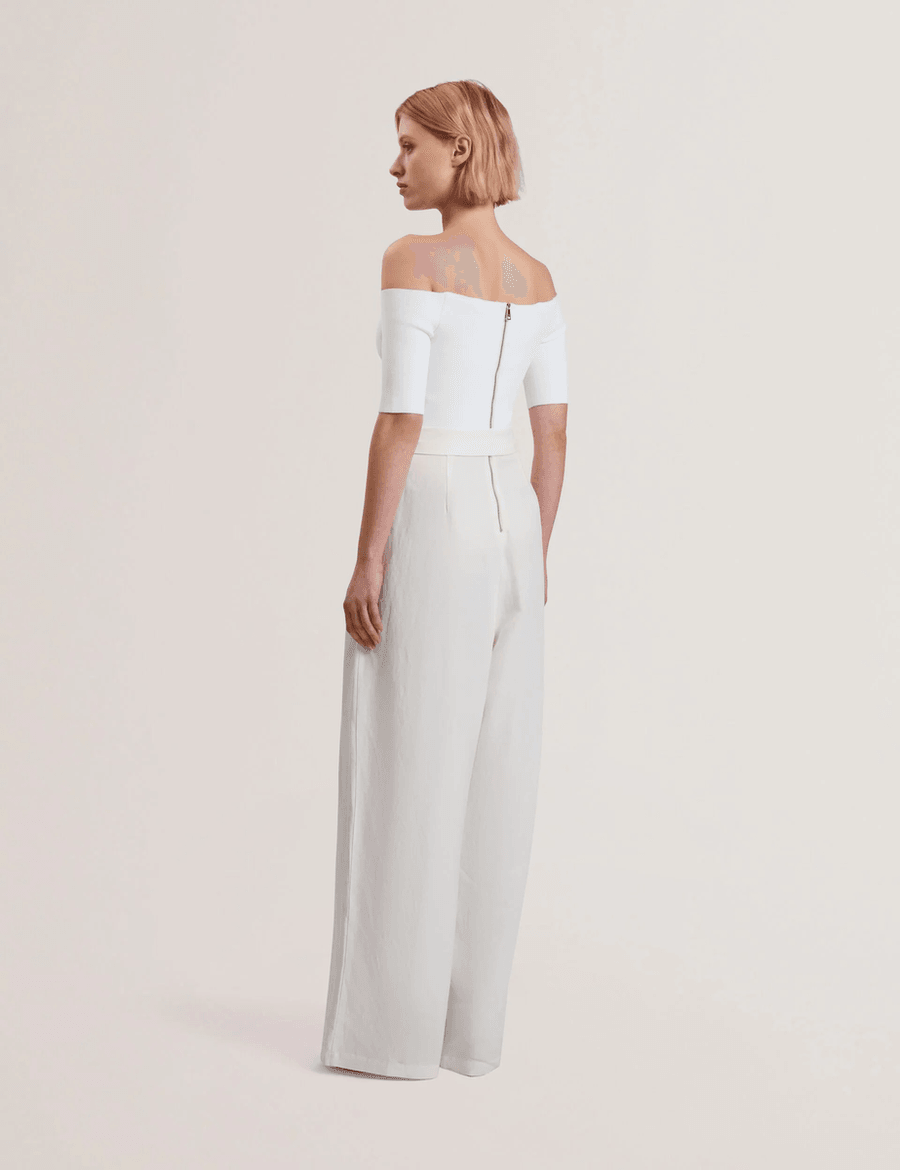 Discover the stunning Ted Baker ANGELIY | WHITE, a must-have wide leg jumpsuit that seamlessly combines sophistication and comfort. This exquisite piece features a knitted bodice and linen blend woven trousers, making it perfect for any occasion, from brunch to evening events.