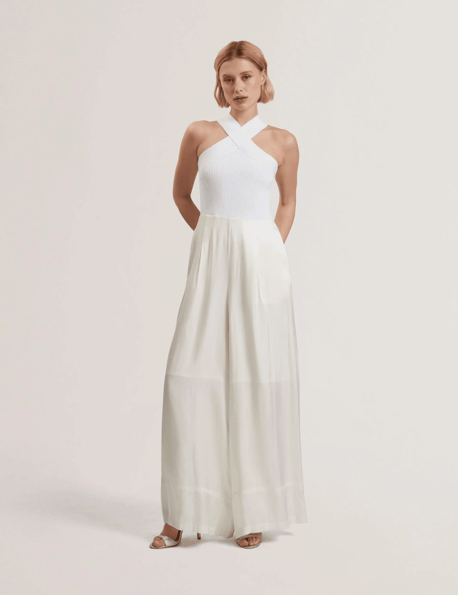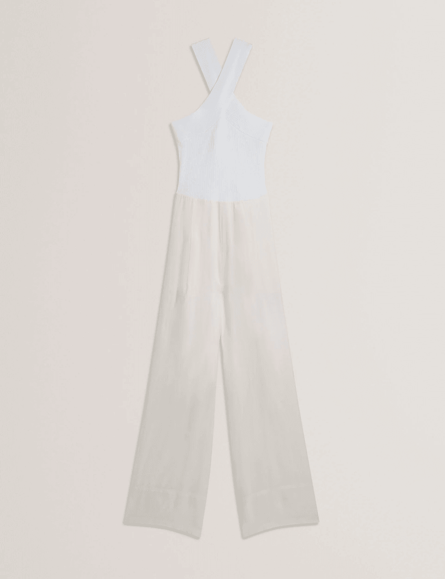 The Ted Baker BAIBLU | IVORY jumpsuit is your go-to outfit for versatility and style. The sleeveless design showcases your shoulders beautifully, while the ribbed knit bodice adds texture and interest. With its wide cross-back straps and lightweight woven trousers, this jumpsuit offers both comfort and a chic appearance.
